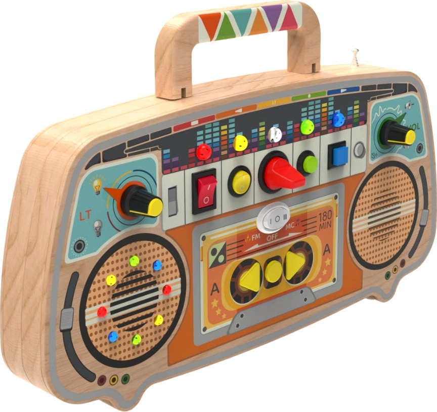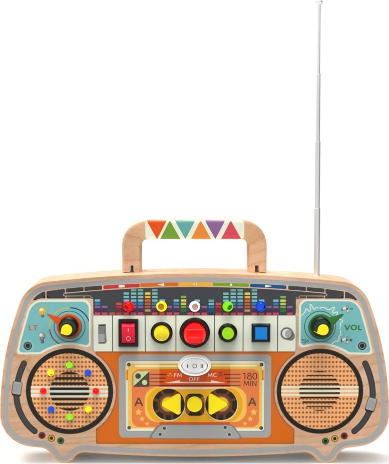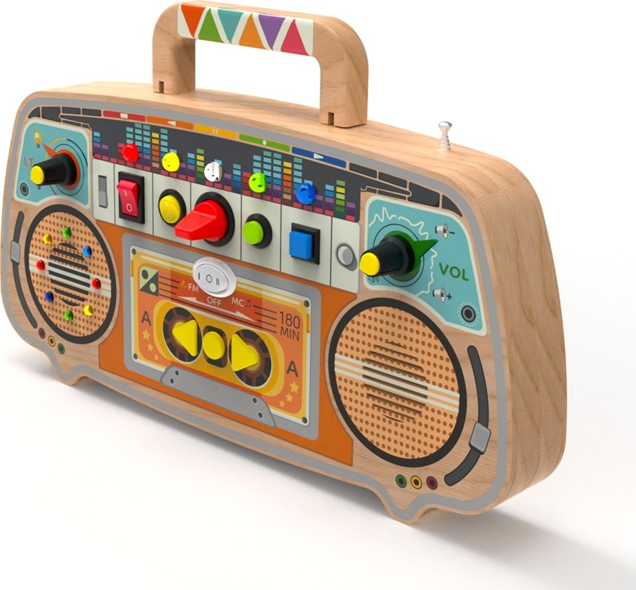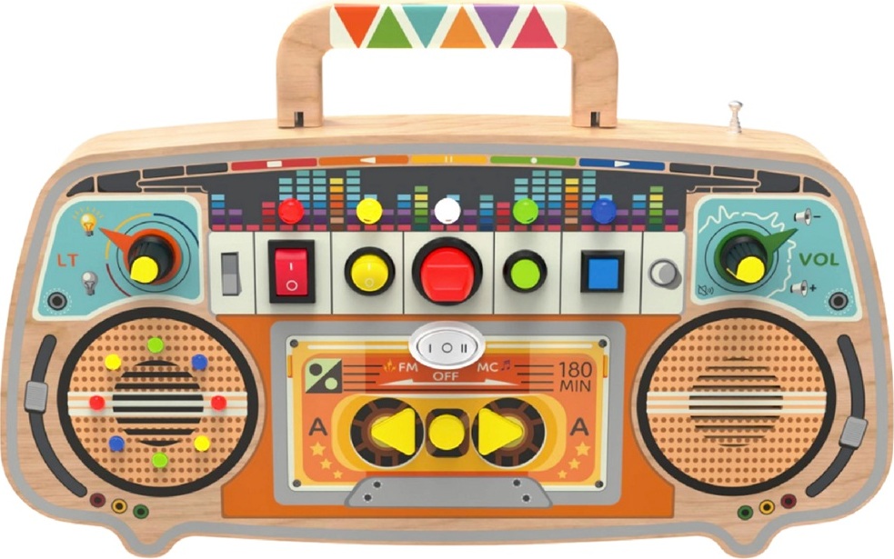 Objavte svet hudby, zvukov a zábavy s interaktívnym FM rádiom, ktoré funguje ako skutočné rádio! Tento originálny drevený activity board v štýle retro rádia okamžite upúta pozornosť najmenších detí vďaka senzorickému LED panelu s farebnými svetielkami a svietiacimi tlačidlami. Chytro navrhnutá kombinácia interaktívnych prvkov, ako sú otočné gombíky, prepínače, posuvníky, štylizované reproduktory, podporuje rozvoj jemnej motoriky, zmyslového vnímania, kreativity a hudobného sluchu. A navyše si deti môžu naladiť skutočné stanice a počúvať hudbu či hovorené slovo! Tiež sa započúvajú do nahraných príjemných melódií, vďaka ktorým sa zoznámia s rôznymi rytmami a hudobnými štýlmi. Praktické drevené madlo uľahčuje manipuláciu a prenášanie hračky. Vďaka veselému dizajnu, funkčnému prevedeniu a kvalitnému spracovaniu je FM rádio nielen pútavým doplnkom detskej izby, ale aj skvelým darčekom pre malých muzikantov a zvedavé deti.