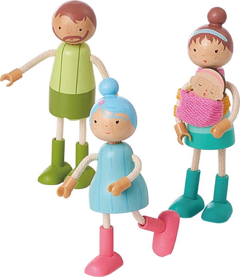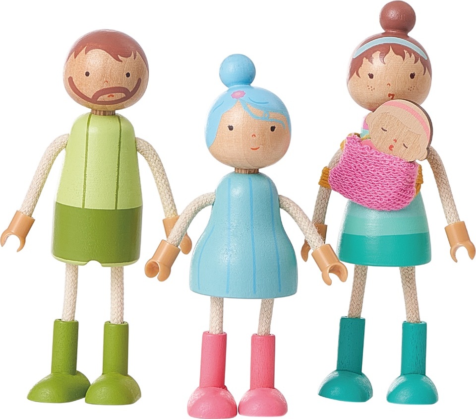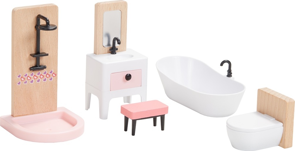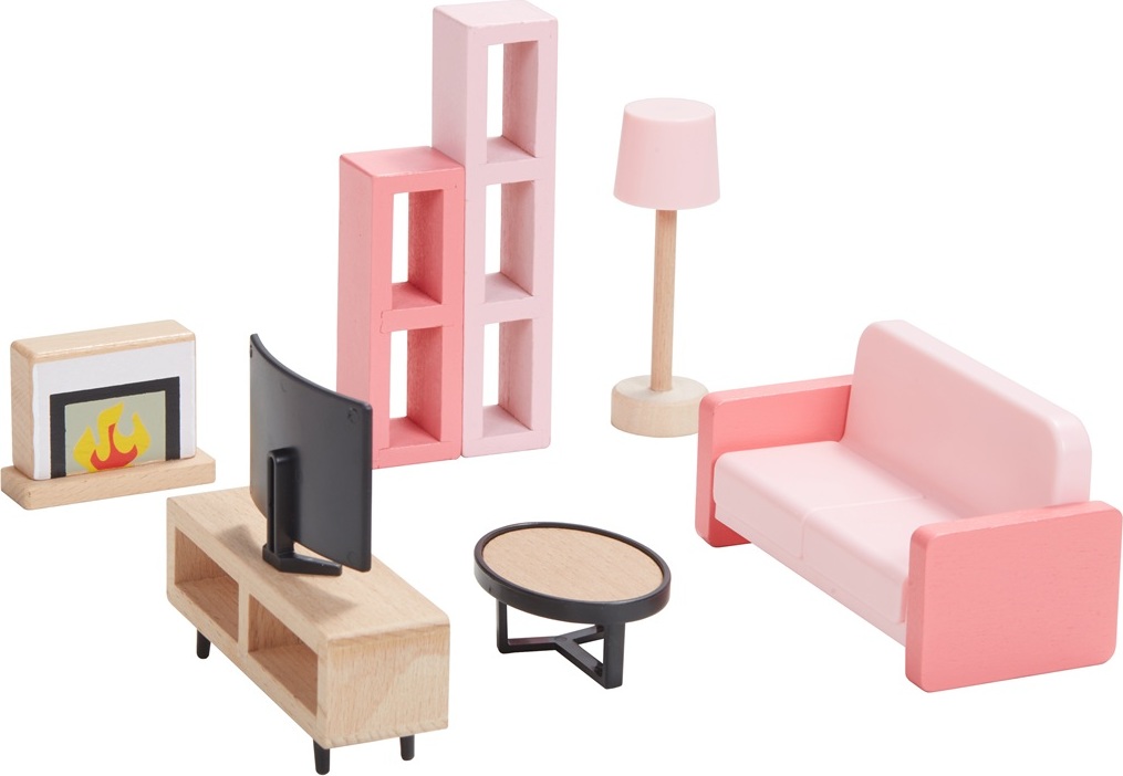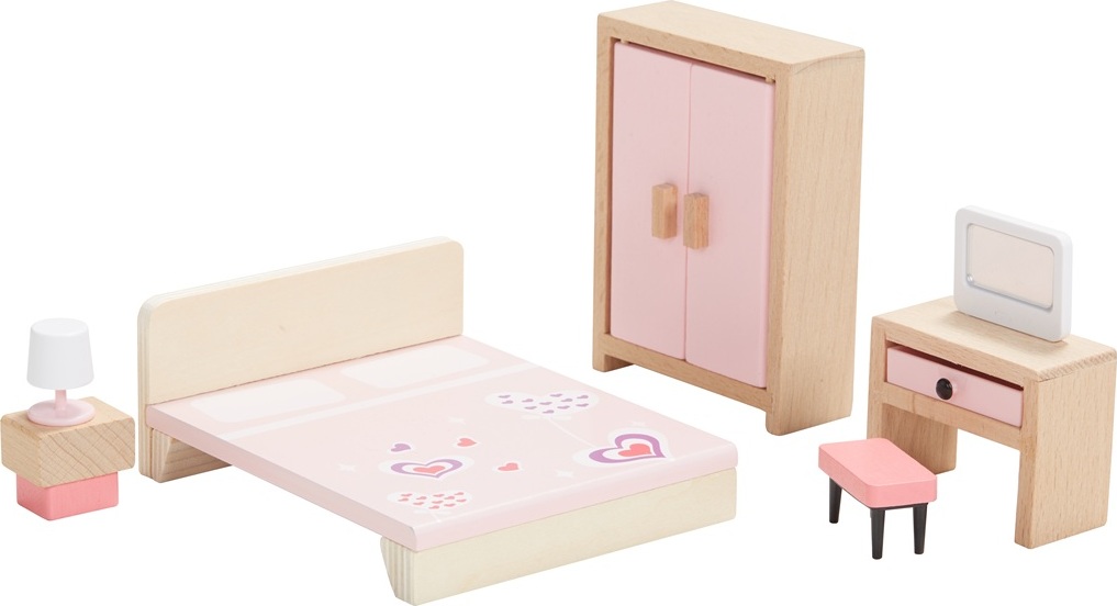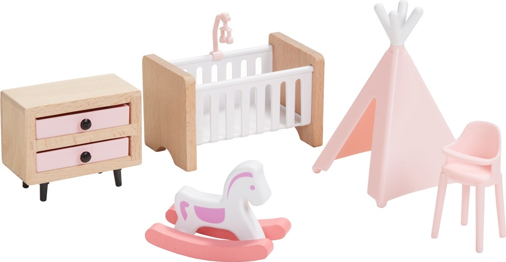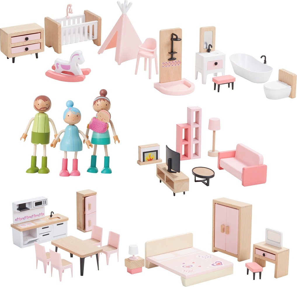Skvelá sada dreveného nábytku, vďaka ktorej si môžete vybaviť akýkoľvek domček. 5 v 1, to je spálňa, kuchyňa, obývacia izba, detská izba, kúpeľňa ak tomu aj celá rodinka. Nádherne detailné drevené kúsky pomôžu mladým predstavám znova a znova vytvárať očarujúce interiérové scény. Skladá sa z 36 kusov. Žiadny domček pre bábiky nie je kompletný bez tejto sady!