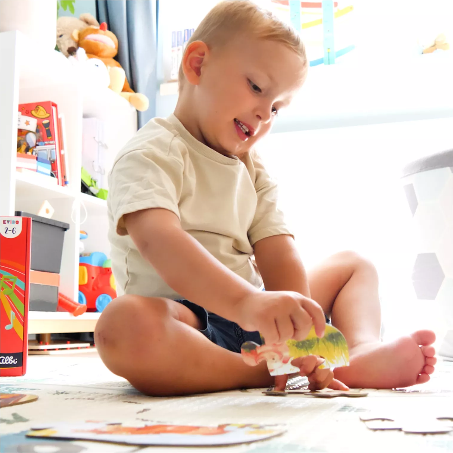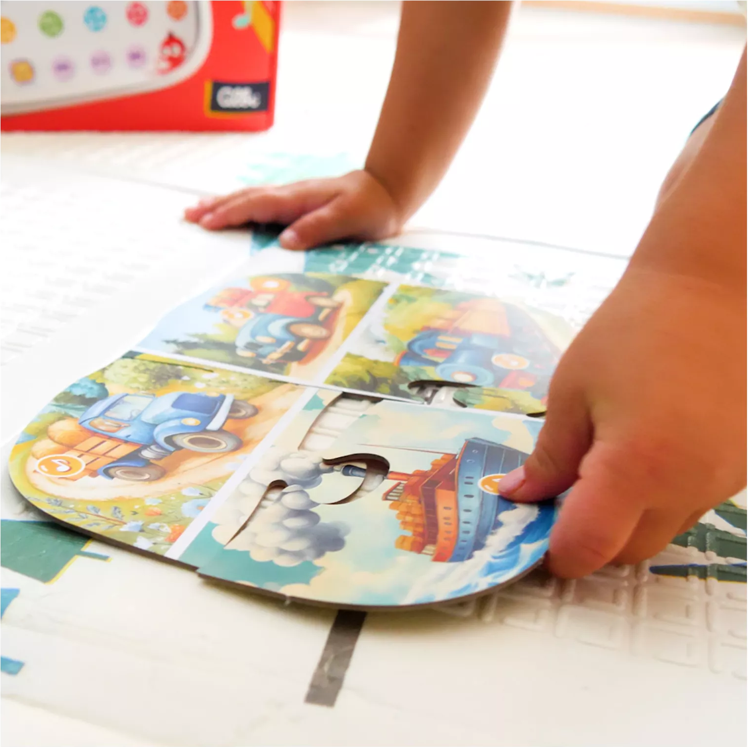 - 2 obojstranné puzzle (4 motívy s dopravnými prostriedkami a zvieratkami z farmy s ozvučenými obrázkami a kvízy)
