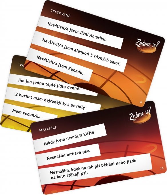 Viete, koľko vašich spoluhráčov už bolo niekedy v Afrike, koľko ich spí v nočnej košeli a koľko z nich pri vysávaní vysáva aj pavúky? Aj keby ste to nevedeli, môžete si tipnúť. V párty hre Tipni si! Poznáme sa? sa dozviete o svojich spoluhráčoch prvý posledný - hoci nikdy si nemôžete byť istí, kto danú odpoveď zvolil. A pokiaľ sa nehanbíte, môžete hrať otvorenú hru a staviť si priamo na odpoveď konkrétneho hráča! Čaká na vás 900 tvrdení, rozdelených do 6 okruhov: Cestovanie, Varenie, Obliekanie, Hobby, Domácnosť a Maznáčikovia. Takže sa o svojich spoluhráčoch dozviete skutočne hromadu nového - a napríklad aj prekvapivého.