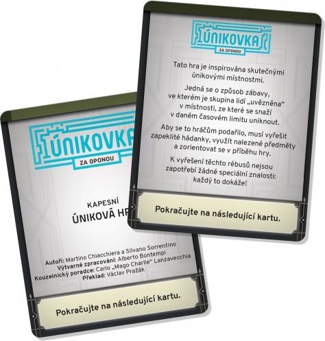 Vrecková verzia celosvetovo populárneho fenoménu! Anonymná obálka vo vašej schránke obsahuje voľné vstupenky na beznádejne vypredanú poslednú kúzelnícku show veľkého iluzionistu Lance Oldmana. Show sa bude konať dnes večer v New Yorku. Už sa nemôžete dočkať: pred vami sa rysuje zábavný a pohodový večer… ale pokiaľ si začnete s mágiou, musíte sa pripraviť na čokoľvek! Zaujmete svoje miesta v hľadisku a akonáhle začnete prichádzať na kĺb niektorým kúzelníckym trikom, show naberie nečakané obrátky! Únikovka je kartovou variáciou na populárne únikové hry, pri ktorých sa skupina priateľov alebo kolegov (možno hrať aj v jednom hráčovi) nechá zamknúť do miestnosti plnej rébusov a snaží sa z nej v časovom limite uniknúť preč. Aj kartová hra Únikovka je plná rébusov, ktoré musíte vyriešiť ak chcete uspieť. A uspejete alebo zlyháte všetci - Únikovka je totiž kooperatívna hra, teda hrajú všetci hráči spolu a nie proti sebe. Hráči spoločne prechádzajú balíčkom kariet, čím sa im odhaľujú nové pravidlá a nové rébusy. Niektoré karty predstavujú hlavolamy, iné pomocníka a ďalšie predmety, ktoré sa budú neskôr hodiť.