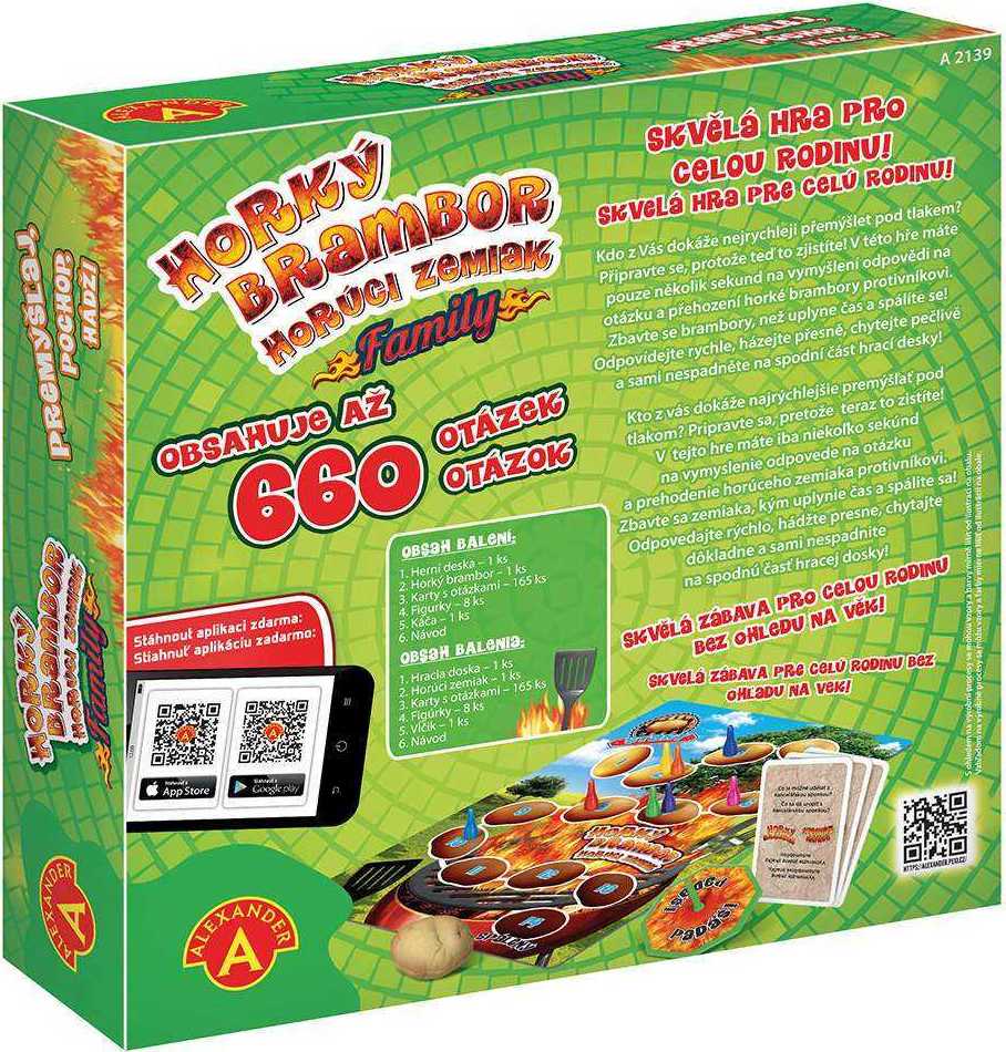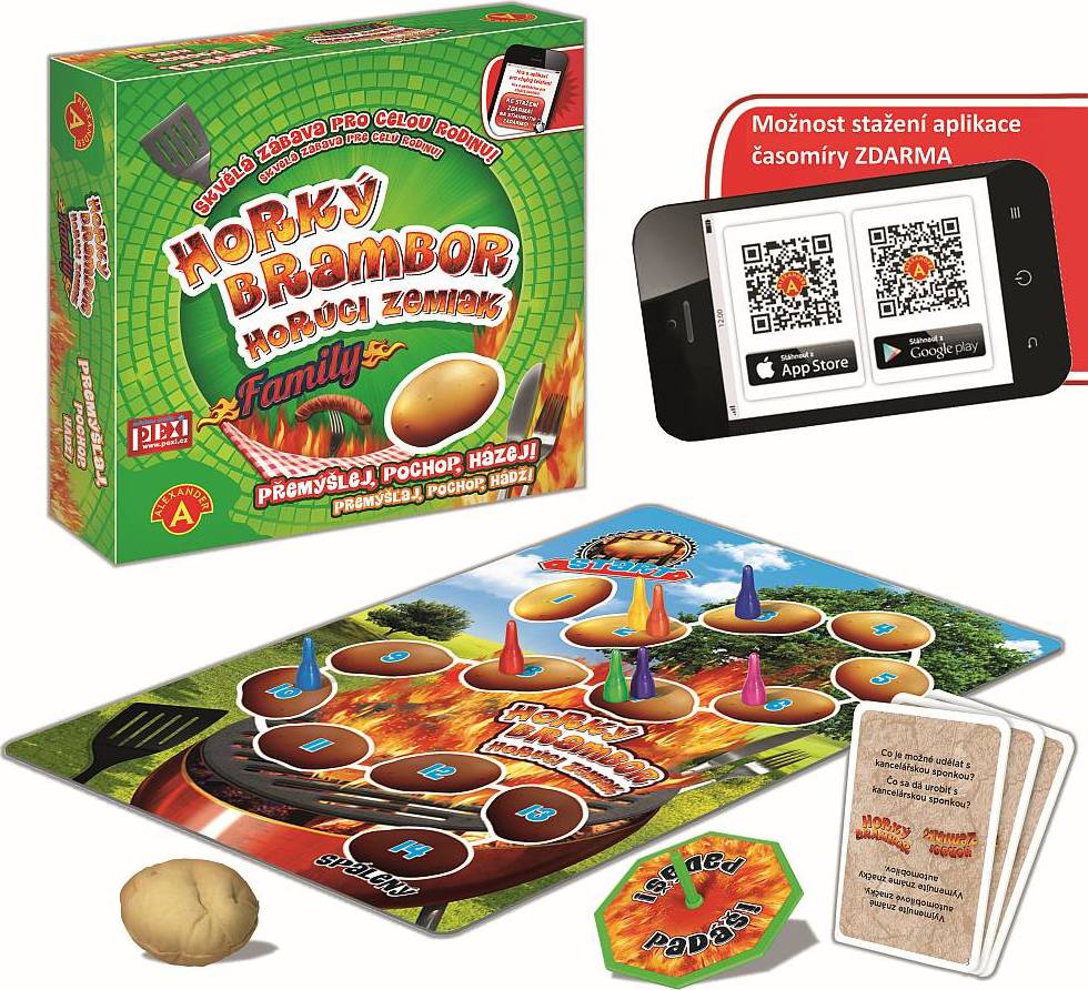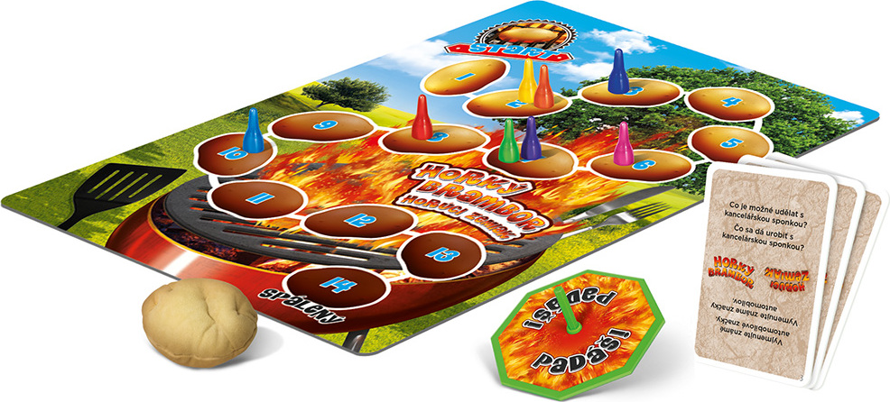 Najlepšia zábava od čias Človeče, nehnevaj sa. Neskutočne živá rodinná hra s jednoduchými pravidlami, ktorú musíš zažiť na vlastnej koži. Zábava pre 2-8 hráčov od 8 rokov do 99 rokov. Odpovedaj rýchlo, hádž presne a zbav sa zemiaky skôr, než dôjde čas! Skvelá zábava pre celú rodinu bez ohľadu na vek! Kto z Vás dokáže rýchlo premýšľať pod časovým tlakom? V tejto hre hľadajú všetci hráči odpoveď na rovnakú otázku. Každý z nich má len pár okamihov na nájdenie správnej odpovede a prehodenie horúceho zemiaka ďalšiemu hráčovi. Kým sa točí káča (alebo beží čas v aplikácii na mobile) stále musíte zodpovedať. Zbavte sa zemiaky, než vám uplynie čas a spálite sa! Odpovedajte rýchlo, hádžte presne, chytajte starostlivo a sami nespadnite na okraj grilu na hracej doske.