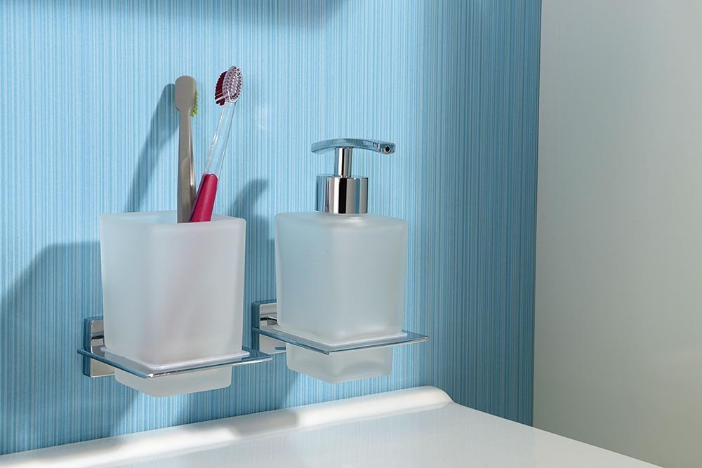 Séria APOLLO zaujme moderným vzhľadom aj zaujímavou cenou. Pohárik, mydelník, nádobka dávkovača mydla a WC štetky sú z mliečneho skla.