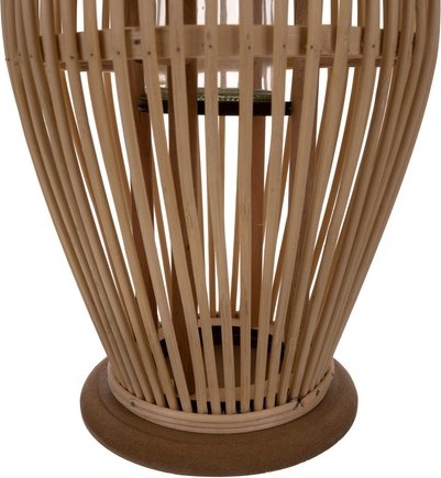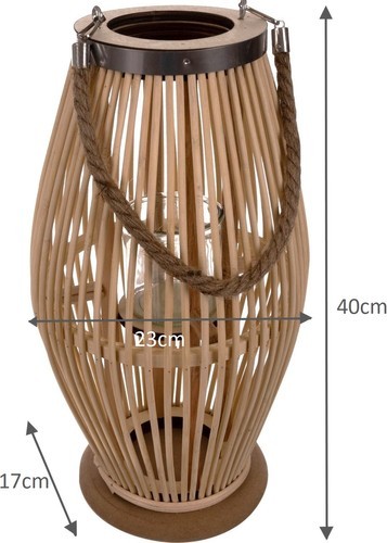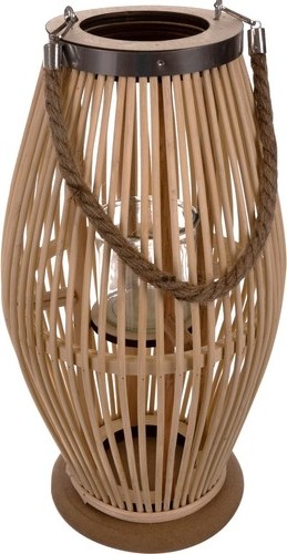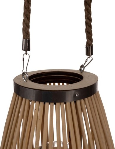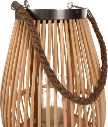 Štýlový a solídne vyrobený bambusový lampáš je dokonalou kombináciou prírodných materiálov s moderným dizajnom, ktorý zapadá do najnovších trendov interiérového dizajnu. Jej prúty sú vyrobené z vysoko kvalitného bambusu, ktorý im dodáva mimoriadnu ľahkosť a zároveň odolnosť. Bambusové prvky sú starostlivo pripevnené a vytvárajú harmonickú a jedinečnú štruktúru, ktorá priťahuje pohľad a dodáva charakter každému interiéru. Vnútorný rám tienidla je vyrobený z kvalitného surového dreva, ktoré zaisťuje stabilitu a odolnosť konštrukcie. Vnútri lucerny je sklenená nádoba, ktorá je ideálnym miestom na umiestnenie sviečky. Sklenené tienidlo chráni plameň pred poryvmi vetra a zároveň umožňuje svetlu krásne prenikať bambusovými tyčami a vytvára tak útulnú a romantickú atmosféru. Lampáš je vybavený rukoväťou zo silného konopného lana, čo jej dodáva ešte rustikálnejšie kúzlo a uľahčuje prenášanie.