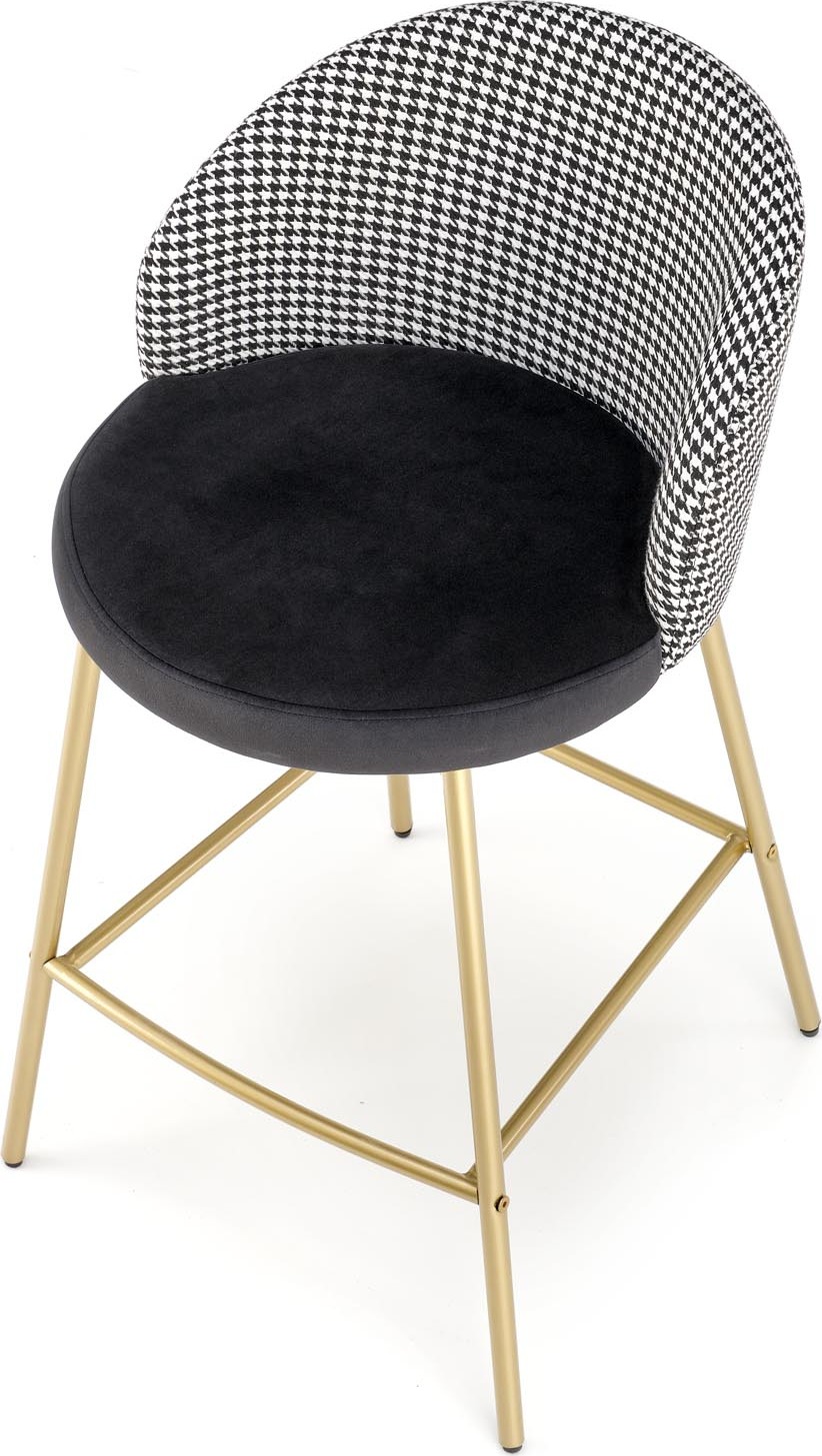 Moderná barová stolička ROOSTER spája moderný dizajn s komfortom používania vďaka ergonomickej chrbtovej opierke a praktickej podnožke. Stolička je vyrobená z odolných materiálov, zaisťuje dlhodobé a stabilné používanie. Táto stolička, čalúnená jemnou zamatovou látkou v atraktívnych čiernobielych farbách s dizajnom kohútej stopy na operadle, sa stane jedinečným doplnkom každého interiéru. Nohy stoličky sú vyrobené z práškovo lakovanej ocele v zlatej farbe. Stolička je ideálna pre umiestnenie pri domácom bare, kuchyne alebo obývacej izby, ponúka nielen komfort sedenia, ale tiež dodáva interiéru štýl.