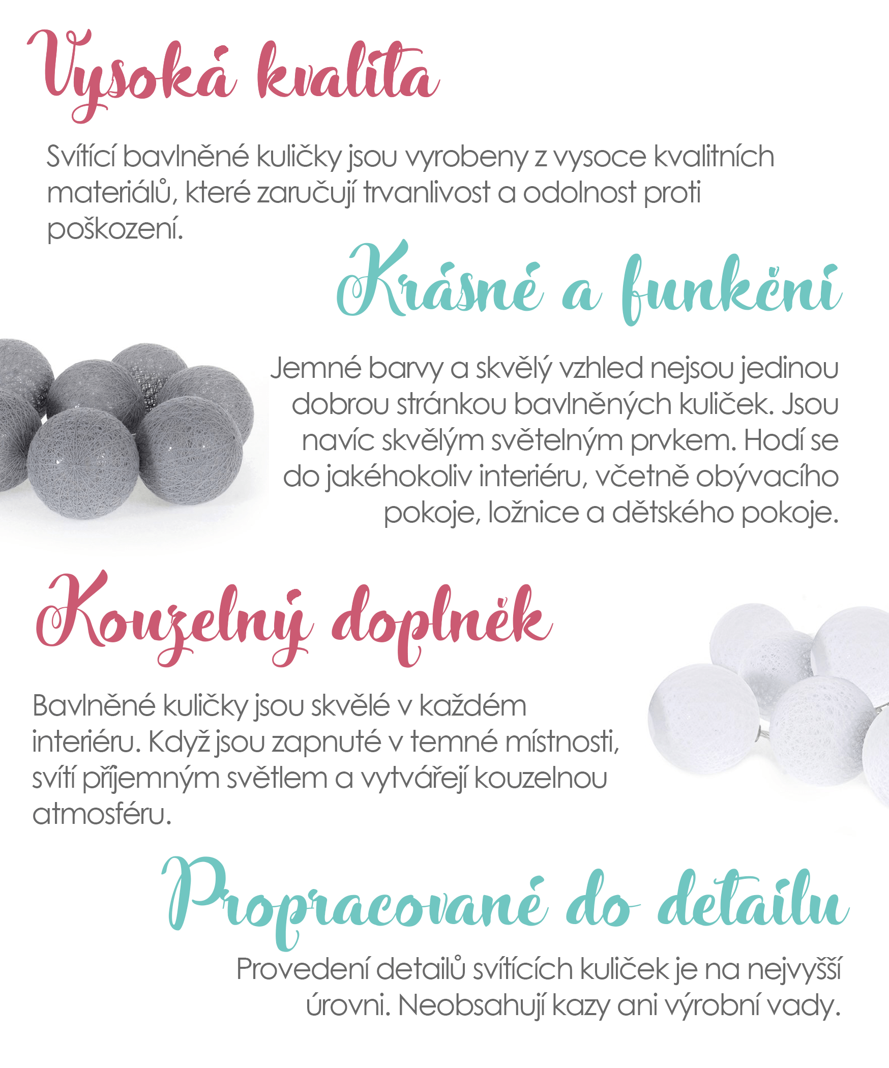 Bavlnené svietiace guličky LED budú skvelým doplnkom v každom interiéri. Svieti príjemným tlmeným svetlom, ktoré vytvoria v každej miestnosti čarovnú atmosféru. Hodí sa do obývacích izieb, spální aj do detských izieb. Svietiace guličky sú vyrobené z najkvalitnejších materiálov, ktoré zaručia ich dlhú životnosť a spoľahlivosť. Prevedenie detailov svietiacich guličiek je na najvyššej úrovni.