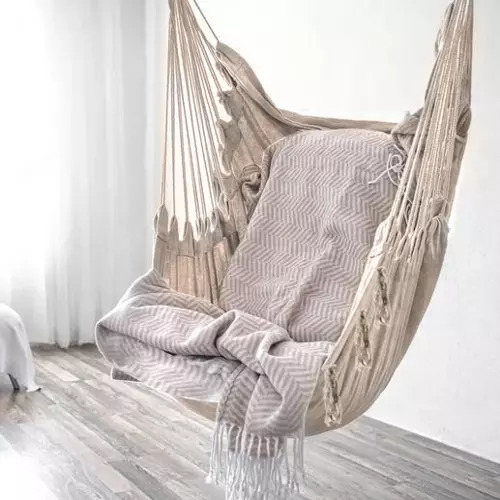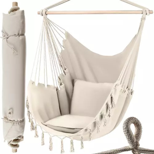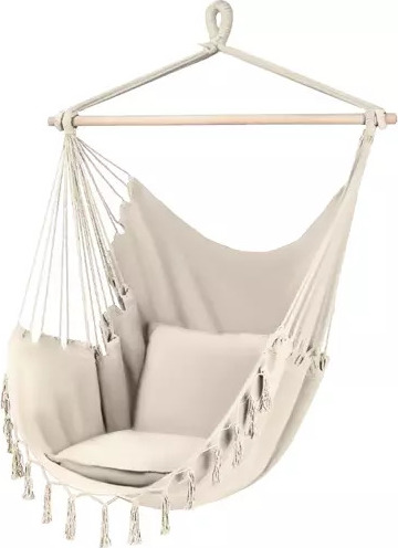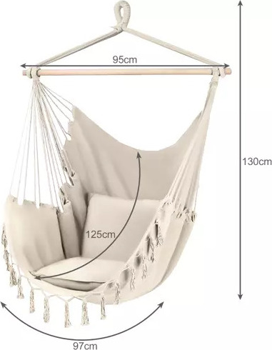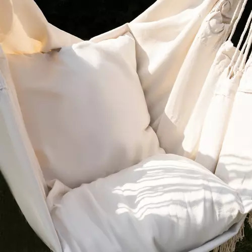 Závesné kreslo funguje ako hojdacia sieť. Má pohodlný mäkký sedák a operadlo z prírodnej bavlny s jemnou prímesou syntetických vlákien. Vďaka tomu je nielen príjemné na dotyk, ale aj odolné. 2 vankúše ku kreslu sú v cene.