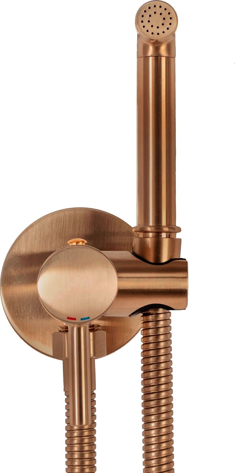 Moderná bidetová batéria vyrobená z mosadze, ktorá je pokrytá vrstvou medenej farby s brúseným efektom (zmatnená). Táto technika chráni batériu pred poškriabaním a koróziou. Ručná sprcha je perfektná pre ľudí, ktorým nepasuje pevná bidetová batéria. Ponúka totiž oveľa väčšiu variabilitu a možnosti pohybu.