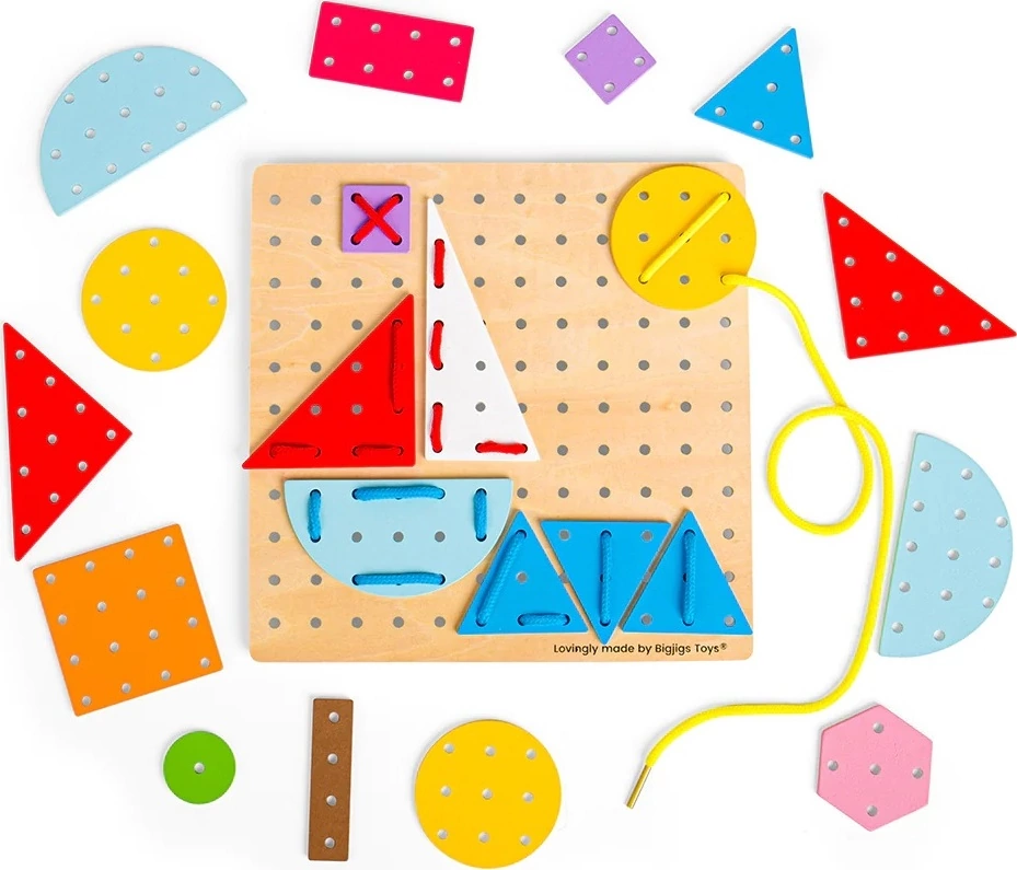 Drevená šnurovacia hra fantastickým a zábavným spôsobom rozvíja jemnú motoriku, kreativitu a obratnosť. Deti prevliekajú šnúrky cez otvory na geometrických tvaroch i základnej doske, aby vytvorili nápaditý a veselý obrázok. Tvary obsahujú množstvo žiarivých farieb, ktoré upútajú a pomáhajú udržať pozornosť. Vyrobené z vysoko kvalitných materiálov zo zodpovedných zdrojov.