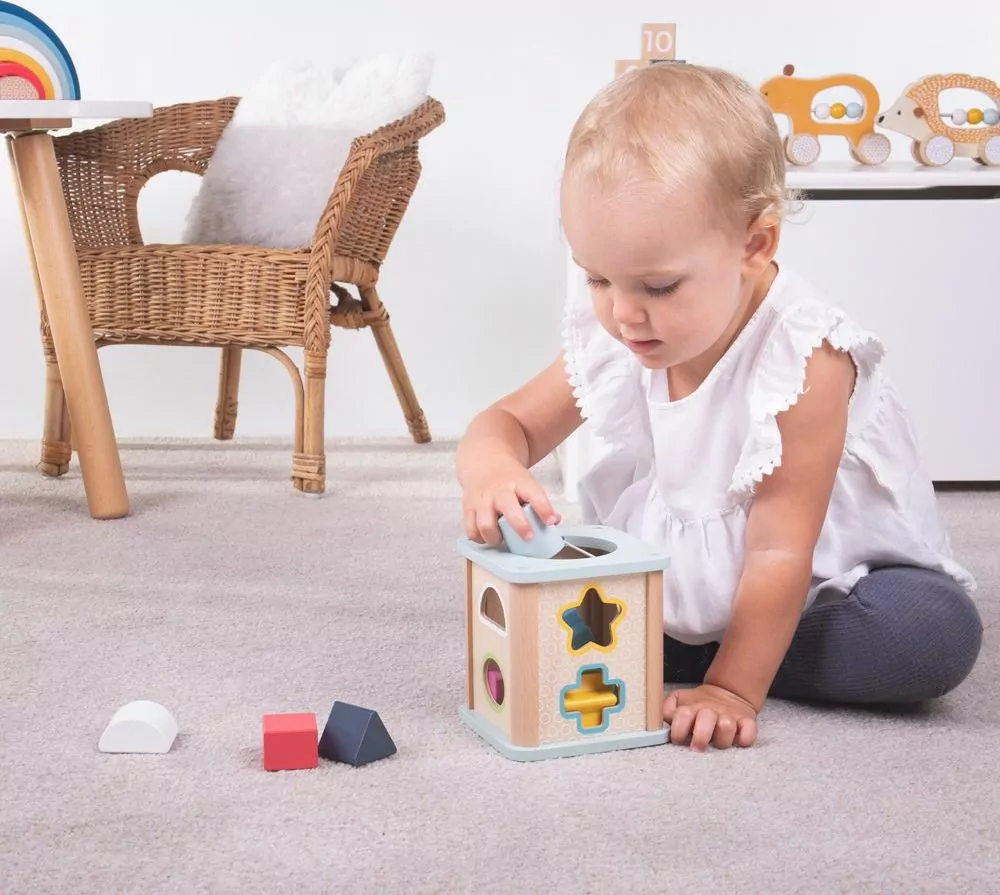 Deti budú touto vkladačkou zo 100% FSC dreva priamo unesené! Vložte farebné kocky do správnych otvorov a pozerajte sa ako padajú doprostred. Kocky je možné vytiahnuť veľmi jednoducho – veľkým vrchným otvorom. Sú cez neho natiahnuté 2 gumičky, aby dieliky len tak nevypadli. Vkladanie dielikov precvičuje zručnosť detí a tiež koordináciu ruka-oko. Pastelové farby a prírodné drevo – vhodné pre chlapcov i dievčatá. Vyrobené z FSC certifikovaných materiálov tým najetickejším spôsobom. Kvalitné drevo značí, že vám hračka vydrží mnoho rokov. Zodpovedá európskym bezpečnostným štandardom.
