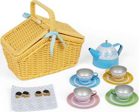 Pozvite svojich plyšových kamarátov alebo bábiky na dokonalý piknik! V prútenom košíku nájdete všetko potrebné pre Vašich hostí: sadu štyroch plechových šálok s podšálkami, 4 lyžičky, 4 tanieriky a kanvicu na čaj s viečkom. Príprava imaginárnych nápojov a podávanie pohostenia prostredníctvom hrania na role je skvelý spôsob, ako rozvíjať sociálnu inteligenciu, jazykové schopnosti, kreatívne myslenie a komunikačné zručnosti a zlepšuje aj jemnú motoriku a koordináciu ruka-oko. Sada je vyrobená z materiálov prvotriednej kvality az zodpovedných zdrojov a je nafarbená netoxickými farbami a lakmi. Spĺňa aktuálne európske bezpečnostné normy.