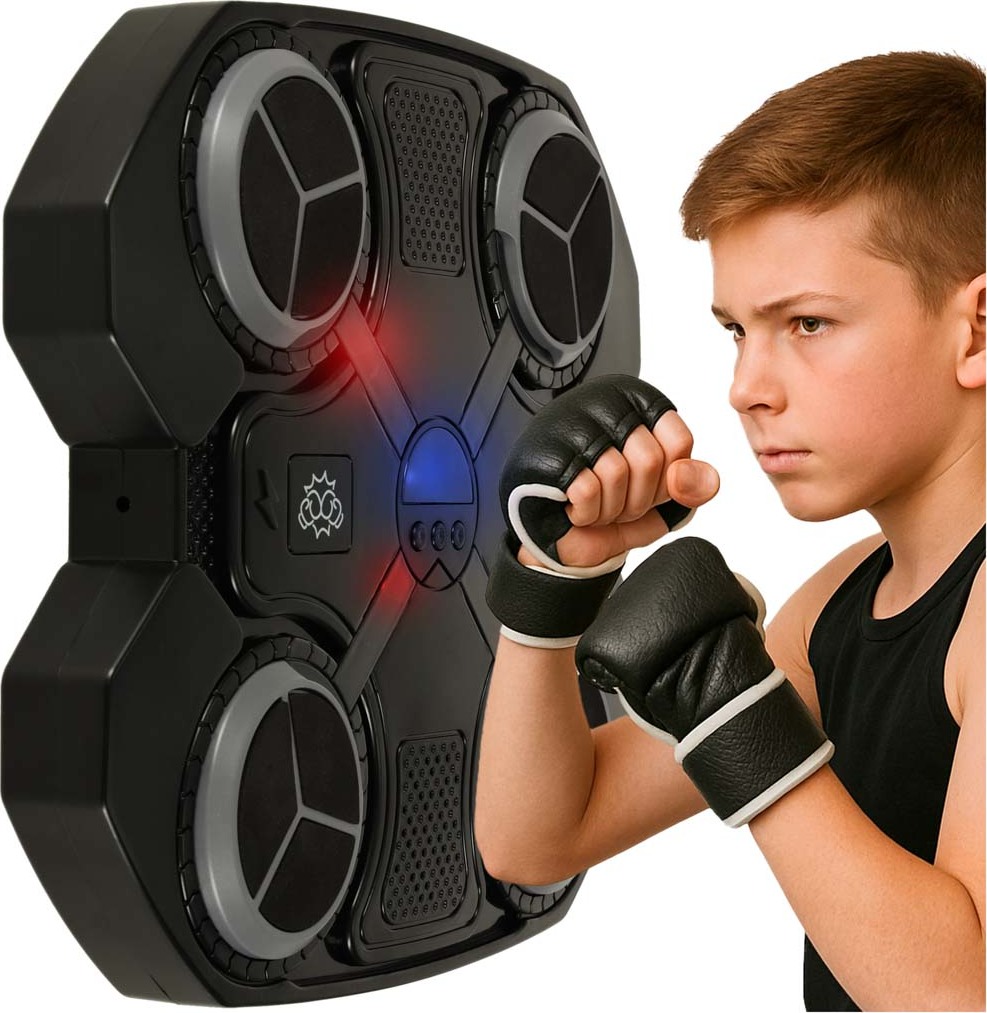 Hľadáte spôsob, ako spojiť zábavu s fyzickým rozvojom? Náš nástenný boxerský terč je perfektným riešením na domáce použitie! Tento interaktívny nástenný terč s Bluetooth a svetelnými efektmi je ideálny pre každodenný tréning v detskej izbe. Umožňuje boxerský tréning v rytme ich obľúbenej hudby a rozvíja koordináciu, reflexy a techniku už od 8 rokov. Tento moderný nástenný boxerský terč bol navrhnutý s ohľadom na mladých bojovníkov. Je vybavený 4 úderovými zónami a umožňuje im precvičovať kombinácie úderov, zasadzovať háky a zdokonaľovať úderovú techniku. Mäkká penová úprava zaisťuje bezpečnosť aj počas intenzívneho boxerského tréningu, ktorý zahŕňa ako úderový, tak aj obranný tréning. Tréning nadobúda nový rozmer s možnosťou prepojenia terča s telefónom cez Bluetooth. Prehrávanie hudby zo zoznamu skladieb a nastavenia hlasitosti umožňuje vášmu dieťaťu trénovať vlastným tempom a rytmom. Nástenný terč sa stáva nielen športovou pomôckou, ale aj motivujúcou hračkou, ktorá vás zaujme na celé hodiny. Vďaka priloženému suchému zipsu a prísavkám je inštalácia terča hračka. Nástenné terče je možné namontovať takmer kamkoľvek – od dverí až po hladkú stenu. Odolný ABS plast a mäkké zóny zaisťujú pohodlie a bezpečnosť počas každého tréningu. Cvičenie na rýchlosť a vytrvalosť nebola nikdy tak ľahko dostupná!