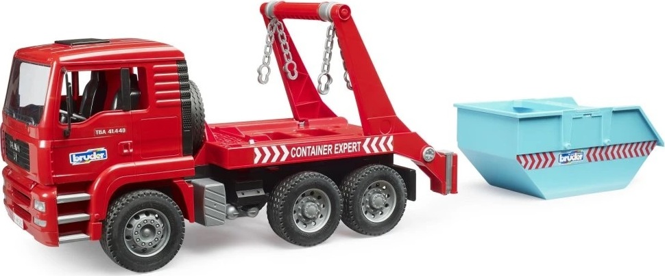 Kontajnery nájdete takmer na každom stavenisku - umožňujú nakladať suť, zeminu aj ďalšie materiály bez toho, aby musel celý nákladný automobil zbytočne čakať. Toto nákladné vozidlo MAN TGA s kontajnerom prináša princíp do sveta detskej hry ako ďalšie vozidlo z radu úžitkových strojov. Kontajner je možné naložiť aj vyložiť jediným pohybom ruky. Po odstránení reťazí môže zostať stáť na mieste a nákladné vozidlo je ihneď pripravené na ďalšie jazdy. Pre lepšiu stabilitu pri manipulácii sú k dispozícii vysúvacie podpery. Sklopná kabína MAN TGA umožňuje nahliadnuť na motorový blok a prináša do hry autentickú atmosféru a zábavu plnú realistických funkcií.