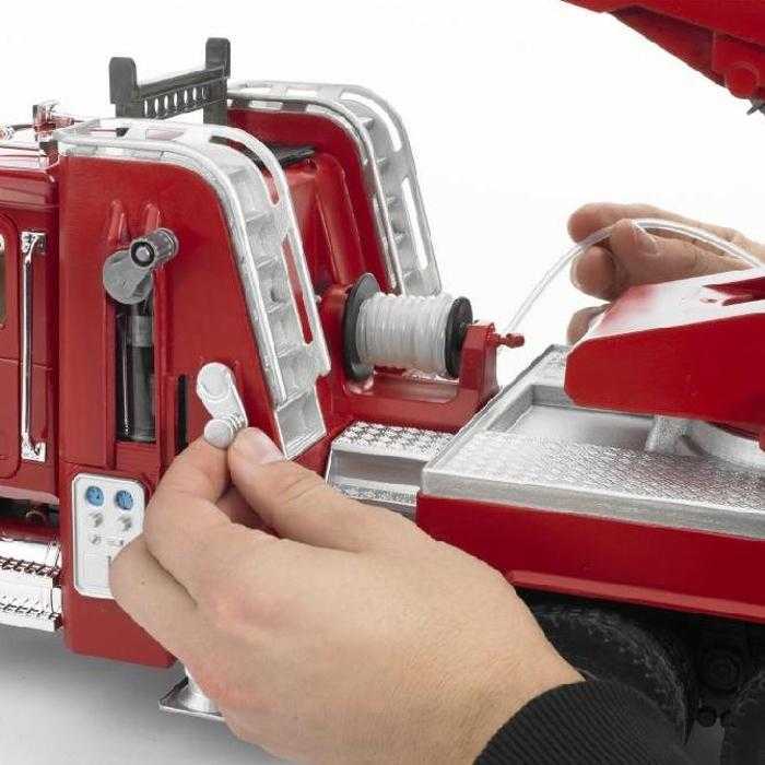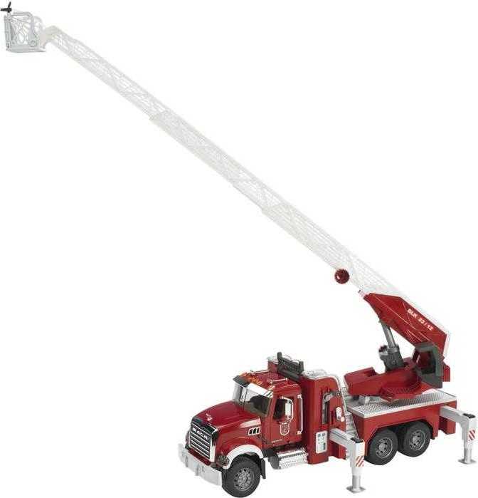 Trojnápravový hasičský automobil MACK Granit s funkčnou striekačkou a otočným výsuvným rebríkom, ktorý je možné vysunúť až do dĺžky 120 cm! Výsuvné rameno je otočné o 360 °. Nechýbajú samozrejme stabilizačné podpery a súčasťou je aj maják so sirénou (BR2801). Hasičské vozidlo má otvárateľné dvere kabíny, sklopné vonkajšie zrkadlá a čelné okno vyrobené z kvalitného priehľadného palykarbonátu. Je osadený mäkkými profilovanými pneumatikami a je možné nahliadnuť pod kapotu na blok motora. Na košíku rebríka je držiak na hadicu, ktorú je možné navíjať pomocou bočnej kľučky. Kompatibilný s postavami Bworld. Vyrobené v Nemecku, z kvalitných materiálov.