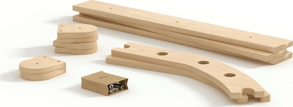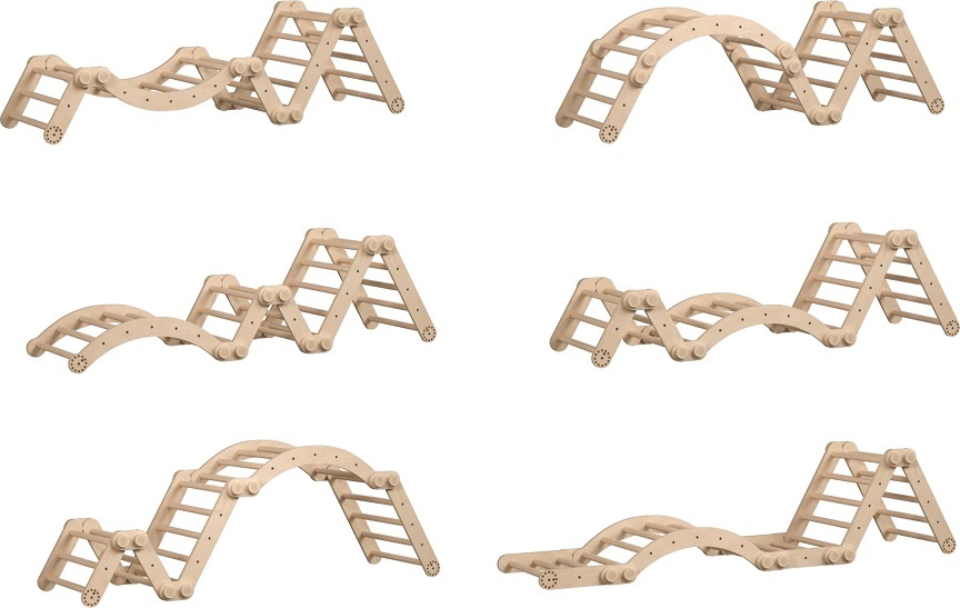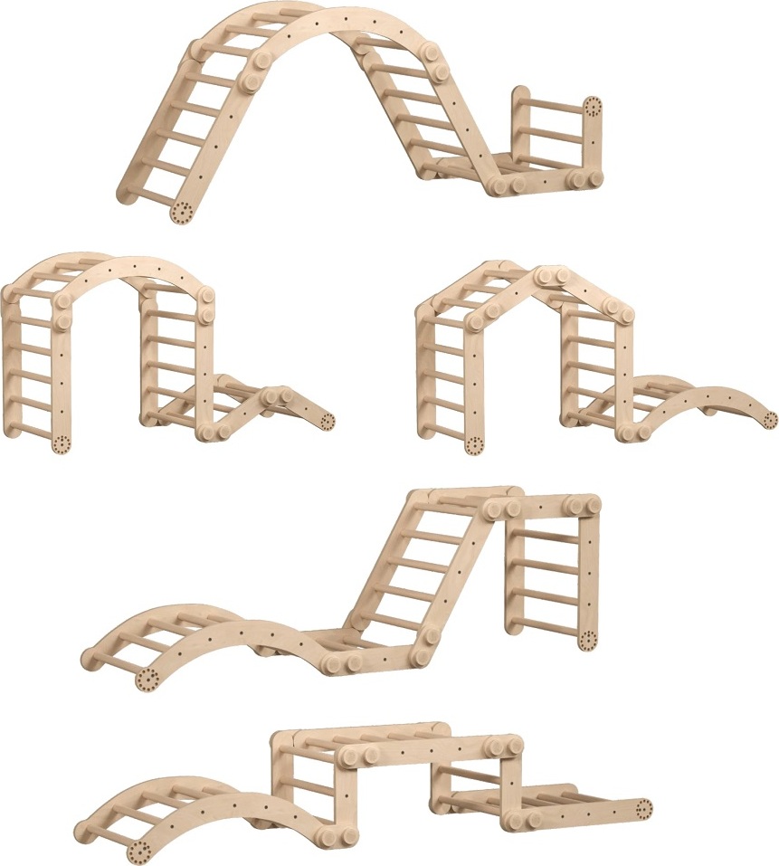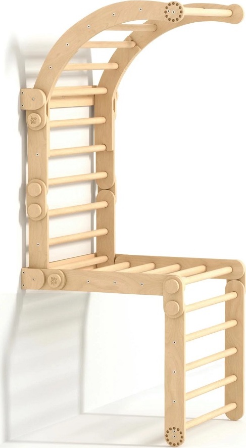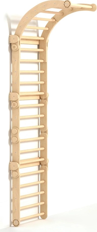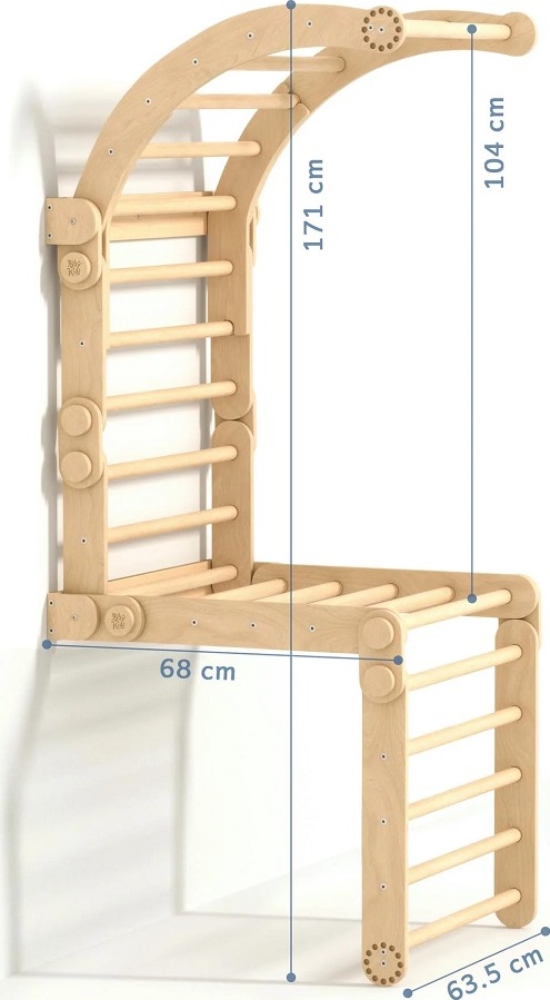 Mať vlastný herný park priamo doma to je sen každého dieťaťa. A čo potom rebrinovú horolezeckú stenu s hrazdou na konci! Táto veľká lezecká stena je vhodná pre menšie deti aj pre tie, ktoré už rady zdolávajú výšky. Rebriny sa skladajú z troch prvkov. Dvoch trojuholníkov a jedného balančného oblúka. Veľký trojuholník má rozmery 51,5 x 63,5 x 66 cm (výška × hĺbka × šírka), malý trojuholník 31,5 × 63,5 × 43,5 cm (výška × hĺbka × šírka) a balančný oblúk je s rozmermi 21 × 63,5 × 75 cm. Táto veľká lezecká sada pre deti kombinuje 2 trojuholníky a malú hojdaciu dosku s možnosťou upevnenia na stenu. Zostavu je možné použiť na zemi na plazenie, státie, lezenie a na skúšanie rôznych variácií hry podľa veku a zručností a špeciálne stenové upevnenie potom transformuje tento modul na skutočnú horolezeckú stenu, ktorá je ideálna pre rozvoj motorických zručností. Vďaka variabilnému dizajnu bude táto sada rásť spolu s dieťaťom, od plazenia a lezenia až po náročnejšie horolezecké výzvy. Produkt je vyrobený z kvalitnej brezovej preglejky, farebné odchýlky, hrče či drobné opravy v dreve sú prirodzené a dodávajú výrobku jedinečný charakter.