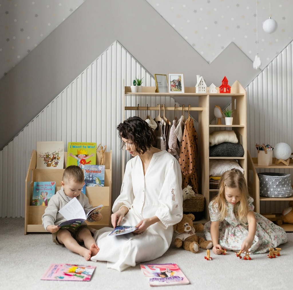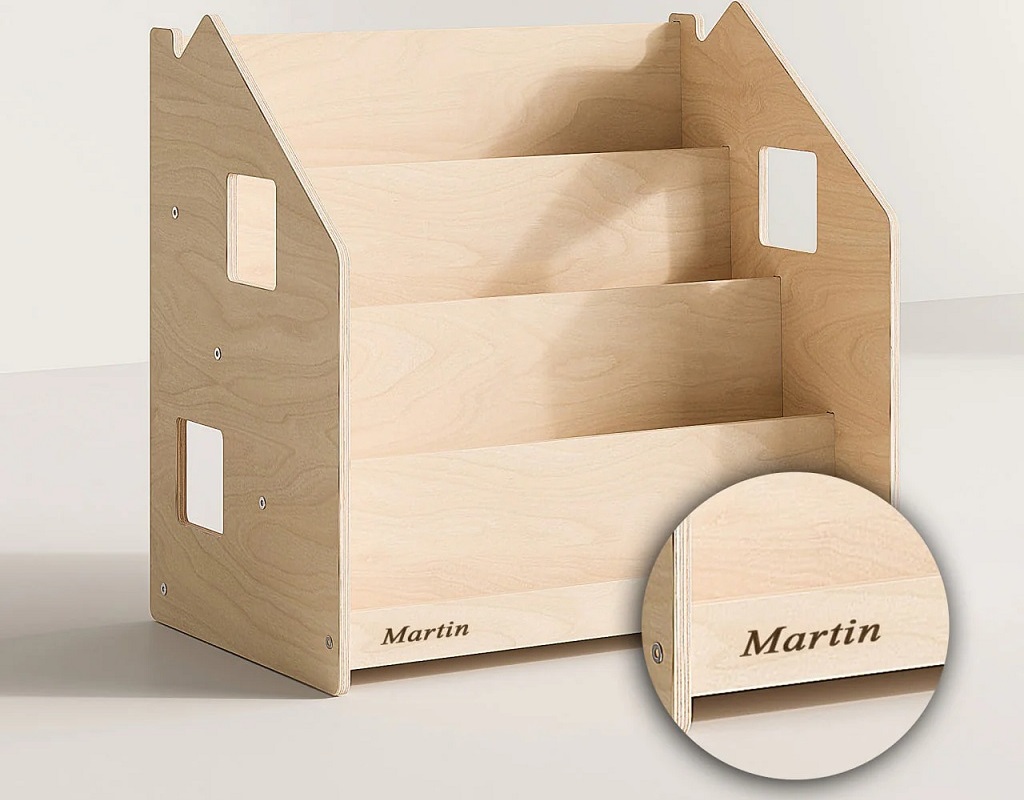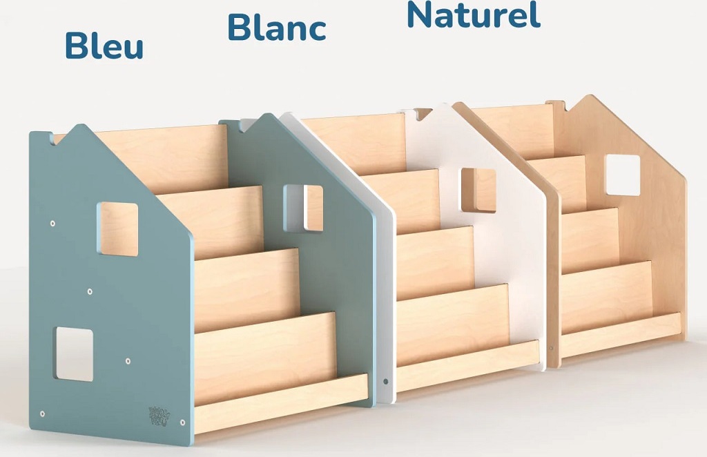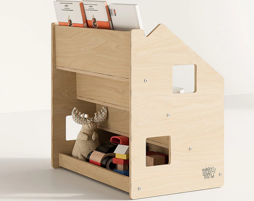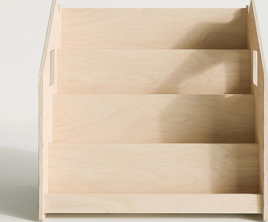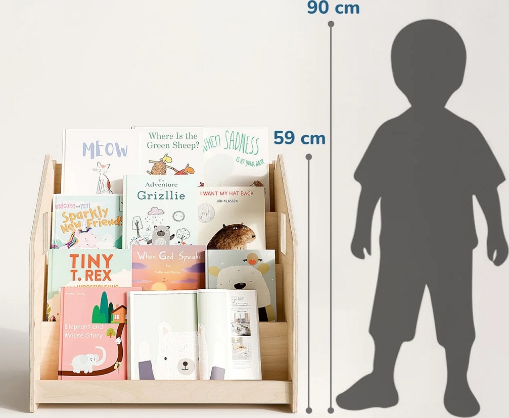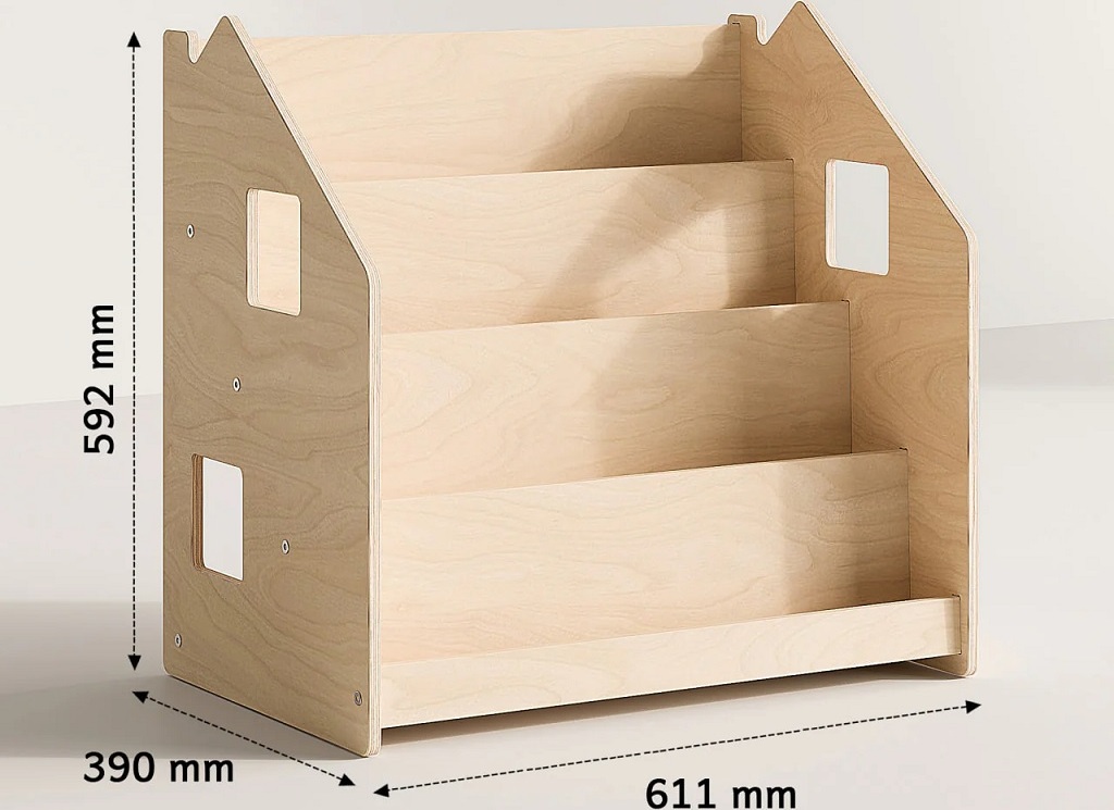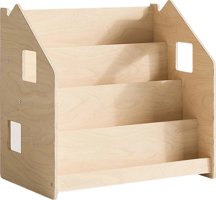 Tento stojan na knihy je navrhnutý tak, aby podporoval detskú samostatnosť a rozvíjal ich záujem o čítanie. Vďaka tomu, že sú knižky vidieť obálkami dopredu, deti si ľahko vyberú tú, ktorá ich zaujme a po prečítaní ju zase jednoducho vráti na miesto. Police ponúka štyri priestranné regály a zadný úložný priestor vhodný pre knihy či hračky. Robustná a bezpečná konštrukcia so starostlivo zaoblenými hranami je ošetrená lakom na vodnej báze. Vďaka jednoduchému, čistému designu krásne zapadne do každého interiéru. Stojan je vyrobený z kvalitnej brezovej preglejky a farebné odchýlky, uzly či drobné opravy v dreve sú prirodzené a dodávajú výrobku jedinečný charakter.