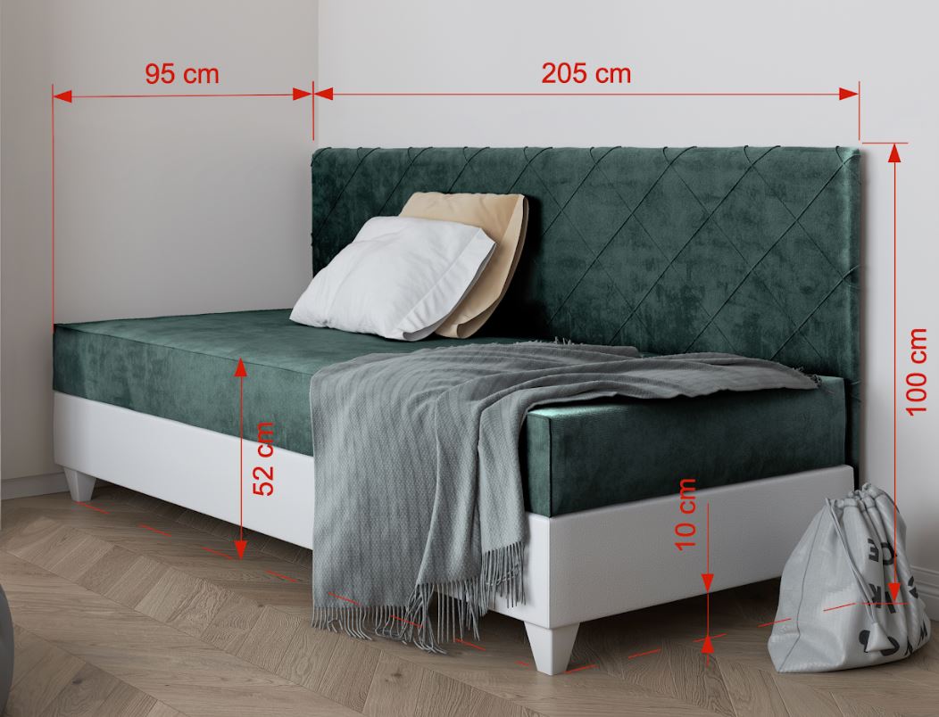 Čalúnená posteľ LAGOS II s praktickým úložným priestorom na lôžkoviny má príjemný látkový povrch. Vďaka tomuto riešeniu je posteľ pohodlná na spanie a zároveň praktická na každodenné použitie. Látkové čalúnenie a vysoké bočné čelo dodáva posteli nielen elegantný nádych, ale zároveň chráni pred chladom od steny. Úložný priestor je potiahnutý ekokožou v bielej farbe. Rozmery spacej plochy 200x90 cm sú vhodné pre jednu osobu, takže je táto posteľ ideálna do malých spální či izieb alebo pre ľudí, ktorí potrebujú miesto na spanie, ale nemajú v miestnosti veľa miesta. Látkový poťah matraca poskytuje pri spánku väčšie pohodlie. Posteľ dodávame s penovým matracom alebo pružinovým bonelovým matracom s výškou 14 cm.