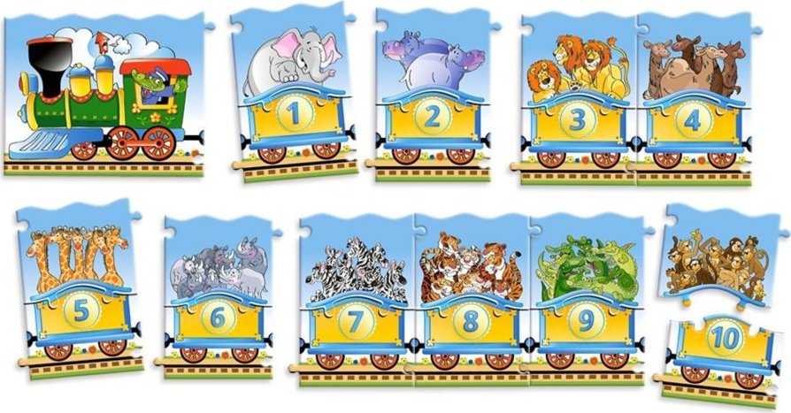Didaktické puzzle, ktoré zábavnou formou zoznamuje najmenšie deti s počítaním. K mašinke sa pripájajú vagóny s číslami a zvieratkami. Ku kazdému vagóniku sa pripája obrázok s patričným počtom zvieratiek (1 - slon, 4 - ťavy, 5 - žiraf, 10 - opičiek .....). Počítajte s deťmi hrochy, zebry a ďalšie zvieratká. Rozmer zloženého puzzle cca 117 x 15 cmVlastnosti