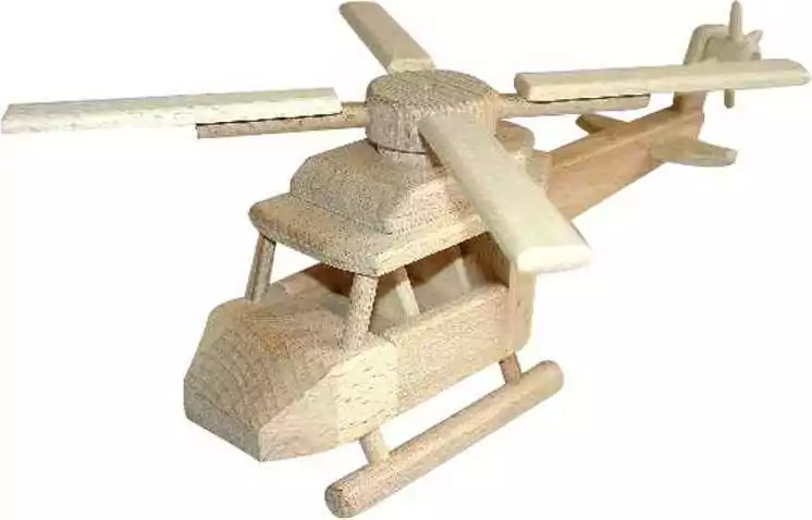 Drevený model vrtuľníka je vyrobený z vysoko kvalitného bukového dreva. Jeho povrch je iba voskovaný a leštený, nie je nijako chemicky upravovaný či farbený, aby bol zachovaný prírodný vzhľad. Drevenému vrtuľníku sa točí vrtuľa a nemá žiadne ostré hrany. Je vhodné aj na pieskovisko.