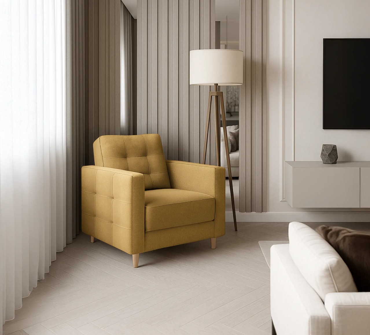 Kreslo TERST škandinávskeho štýlu, ktorá sa hodí do moderne zariadeného interiéru. Charakteristickým znakom pohovky sú drevené nohy a prešívanie na operadle a bokoch.