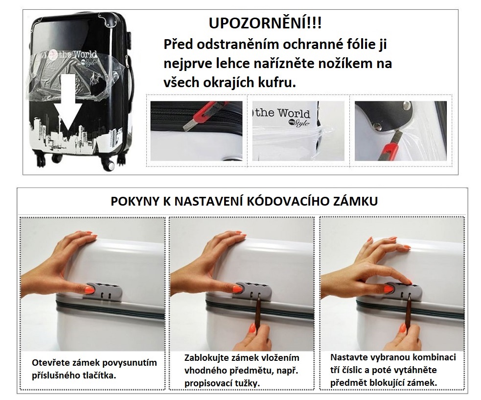 Všetky nami ponúkané kufre sú úplne nové a zdravotne nezávadné. Pri výrobe sú štandardne vybavené ochrannou fóliou, ktorú jednoducho odstránite. Pred odlepením fólie ju najprv jemne narežte nožíkom na všetkých okrajoch kufra a okolo všetkých spojovacích komponentov.