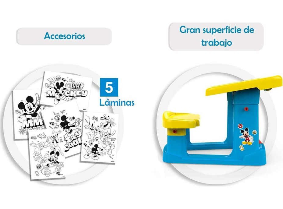 Prvá detská školská lavica: stolček s pohodlným a priestranným sedátkom zdobený motívom myšiaka Mickey, v doske stolčeka je priehradka pre rôzne potreby na kreslenie a tvorenie, pod lavicou je podnožka pre maximálne pohodlie, súčasťou je 5 omaľovánok, vyrobená z vysoko odolného plastu. Rozmery: 57,5 x 72,5 x 49 cmVlastnosti
