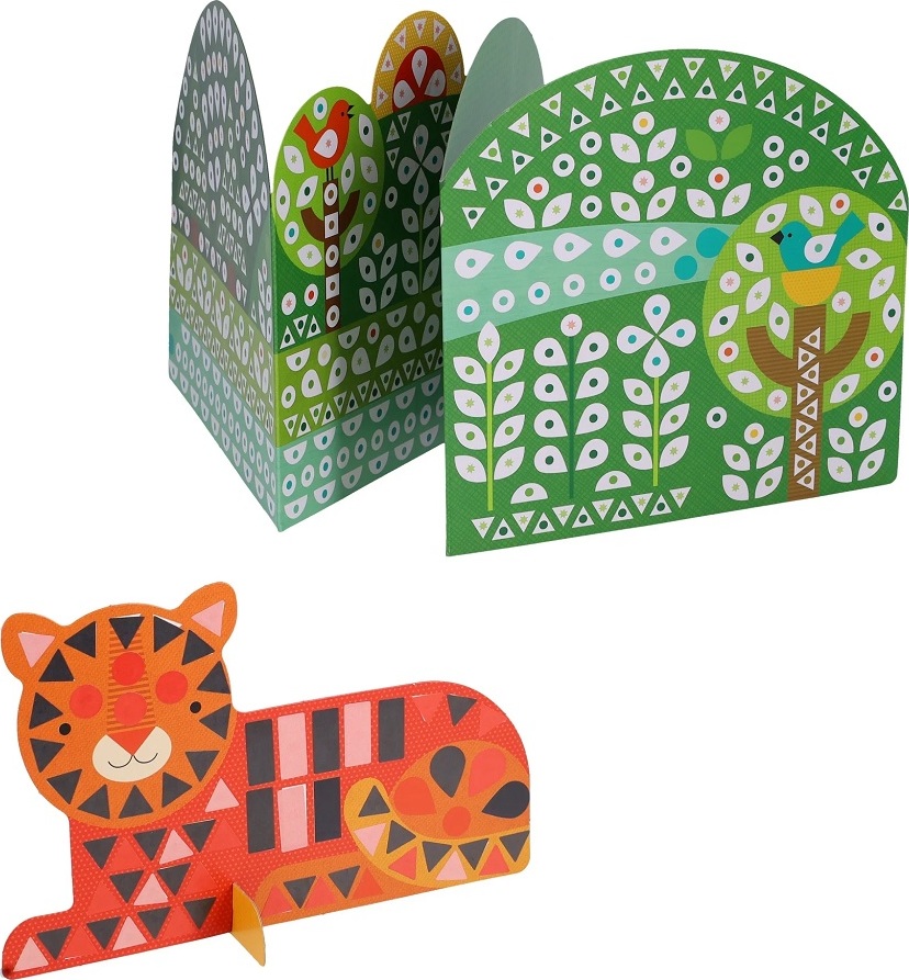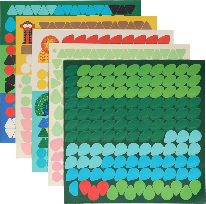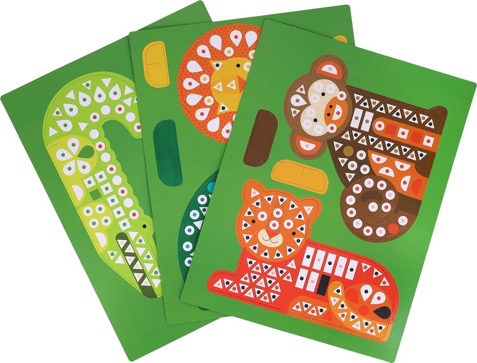 Vytvorte si s touto sadou vlastný zverinec. Divoká krajina pokrýva štvordielne rozkladacie pozadie, ale potrebuje váš finálny detail! Použite viac ako 1000 samolepiek na vyplnenie medzier v mozaikovej kresbe a vytvorte si vlastnú scénu. Ale čo by to bolo za divočinu bez zvierat? Spojte farby bodiek s farbami samolepiek a dokončite tak šesť postáv: tigra, krokodíla, opicu, páva, sovu a leva. Akonáhle sú pripravené zvieratá aj scéna, usporiadajte pred obojstranným pozadím divadlo a vdýchnite svojmu umeleckému dielu život! Táto sada je vyrobená z materiálov FSC a potlačená rastlinnými farbami, takže neobsahuje plasty.