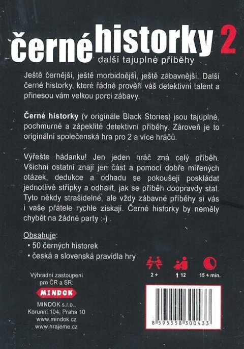 Čierne historky 2 sú tajuplné, pochmúrne a zapeklité detektívne príbehy. Zároveň je to originálna spoločenská hra pre 2 a viac hráčov. Ešte čiernejšie, ešte morbídnejšie, ešte zábavnejšie! Ďalšie čierne historky, ktoré riadne preveria váš detektívny talent a prinesú vám veľkú porciu zábavy. Vyriešte hádanku! Len jeden hráč pozná celý príbeh. Všetci ostatní poznajú len časť a pomocou dobre mierených otázok, dedukcie a odhadu sa pokúšajú poskladať jednotlivé čriepky a odhaliť, ako sa príbeh naozaj stal. Tieto niekedy strašidelné, ale vždy zábavné príbehy si vás aj vašich priateľov rýchlo získajú. Čierne historky by nemali chýbať na žiadnej párty!