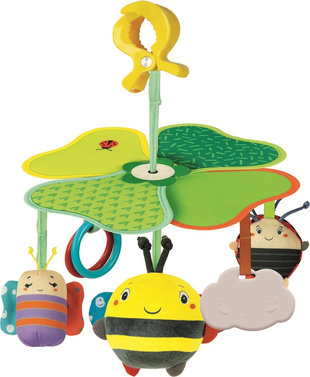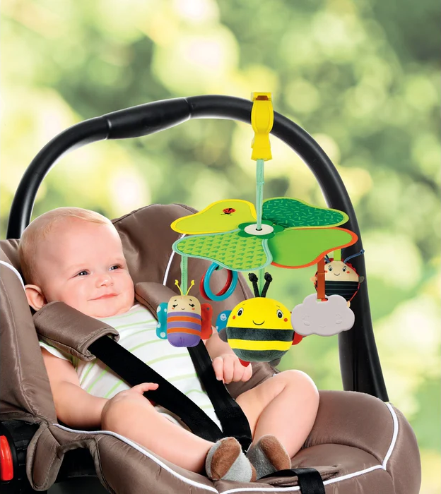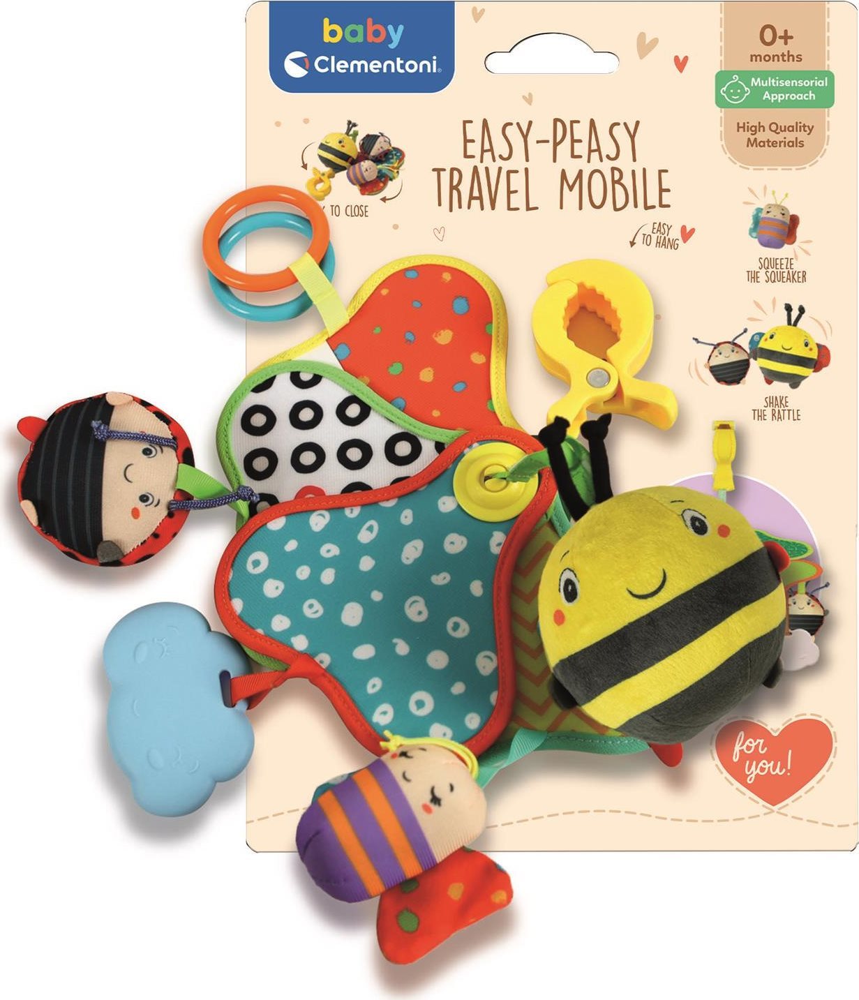 Veselý závesný kolotoč so zvieratkami je ideálny na cesty, k autosedačke, do postieľky či ku kočíku. Farebné závesné hračky vydávajú zvuky, povzbudzujú detskú zvedavosť a rozvíjajú zmysly. pískací motýlik so šuštiacimi krídelkami hrkajúca malá lienka rolnička vo veľkej včielke plastový mráčik a dva krúžky zvieratka sú zavesené na krásnych listoch farebné rastliny svorka na zavesenie Rozmery: 30 x 25 x 25 cm. Upozornenie: Návod na použitie je na obale výrobku. Značka BABY CLEMENTONI je synonymom kreativity, nadšenia a dôrazu na kvalitu. Hračky pomáhajú rodičom pri komunikácii s dieťaťom. Vzhľad hračky a jej inovatívne farby, netoxické a pevné materiály, vytvarovaný povrch a rôzne funkcie pomáhajú pri rozvoji hmatových a sluchových schopností, napomáhajú pohybovej aktivite a vyvolávajú prvé logické asociácie.Vlastnosti
