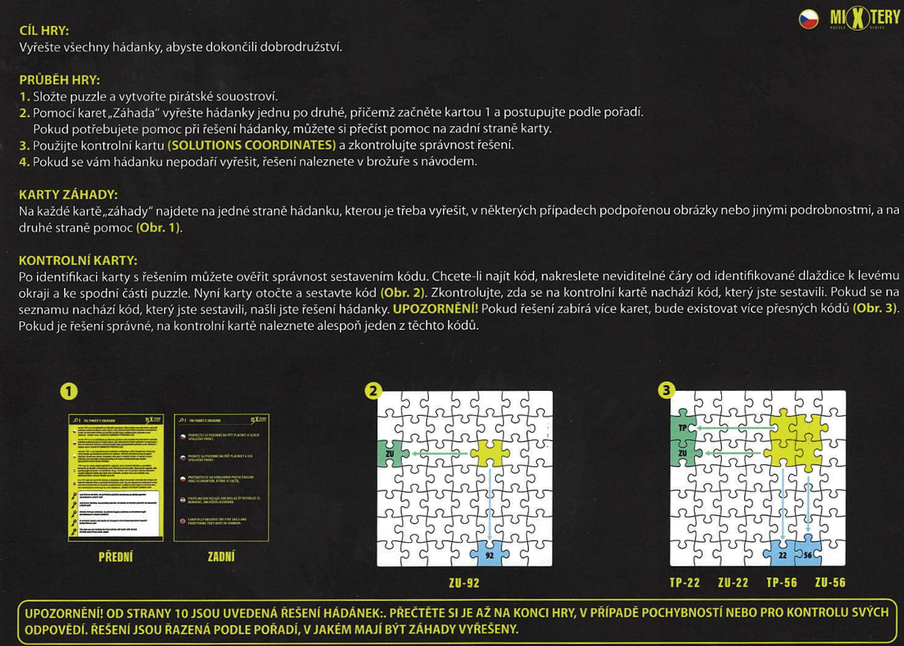 MIXTERY puzzle je tajomné puzzle skrývajúce niekoľko hádaniek. Po zložení obrázku je potrebné v hádankách nájsť vodítka a vyriešiť ich, aby ste mohli pokračovať v hre. Pátrajte ako skutočný detektív a rozlúšte záhadu tejto hry. Obsah balenia: puzzle predloha skladaného motívu 12 kartičiek s hádankami pokyny a riešenia k hádankám návod SK, SK, PL, HU, EN Rozmer zloženého puzzle cca 49 x 36 cmVlastnosti