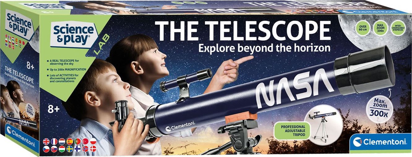 Kvalitný detský astronomický ďalekohľad zo série Science&Play od Clementoni. Detský teleskop ďalekohľad inšpirovaný NASA, ideálny na objavovanie hviezd, Mesiaca a nočnej oblohy. Optický tubus s objektívom s priemerom 50 mm, doplnený výmennými okulármi (6 mm a 12 mm) pre kvalitné zväčšenie medzi 50× až 100×, navyše Barlow šošovka pre trojnásobné zväčšenie. Robustný statív s výškou až 130 cm, ktorý zaisťuje stabilné pozorovanie a ľahký transport. Obsahuje ilustrovaný návod, ktorý deťom pomáha jednoducho pochopiť základy astronómie a pozorovacích techník. Doporučené pre deti od 8 rokov, vyvinuté v Taliansku s dôrazom na vzdelávaciu hodnotu a bezpečnosť ako súčasť série STEM hračiek.