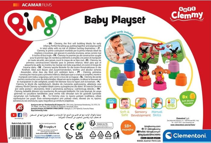 Zábavná sada určená pre malé deti, ktoré sa môžu hrať s priateľskými postavičkami Binga a Suly. Prepojenie príbehu s obrázkami, rozprávaním a skladaním podporuje detskú predstavivosť, rozvíja zmyslové vnímanie, manuálnu zručnosť a priestorové vnímanie, knižočka z pevného kartónu s Bingom a Sulou (10 x 10 x 1,5 cm) s krúžkom na zavesenie, 2 postavičky: Bing + Sula (možno nasadiť na kocky), 8 mäkkých CLEMMY kociek. POZNÁMKA: Kocky je možné používať aj pri hraní vo vode, dajú sa prať v práčke pri max 30°C. Značka BABY CLEMENTONI je synonymom kreativity, nadšenia a dôrazu na kvalitu. Hračky pomáhajú rodičom pri komunikácii s dieťaťom. Vzhľad hračky a jej inovatívne farby, netoxické a pevné materiály, vytvarovaný povrch a rôzne funkcie pomáhajú pri rozvoji hmatových a sluchových schopností, napomáhajú pohybovej aktivite a vyvolávajú prvé logické asociácie. Z výrobkov firmy sú na slovenskom trhu obľúbené najmä CLEMMY kocky, ktoré sú vyrobené z mäkkej netoxickej gumy. Tá je zároveň ľahko umývateľná a má ľahkú vanilkovú vôňu.Vlastnosti