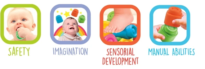 Bezpečné hranie s mäkkými farebnými kockami pre deti už od 6 mesiacov! Vďaka CLEMMY kockám môže dieťa stavať svoje prvé komíny a stavby. Hra s kockami rozvíja senzorické vnímanie, manuálnu zručnosť a priestorové vnímanie. Hra so stavebnými kockami podnecuje fantáziu a deti sa zabavia na dlhé hodiny. Balenie obsahuje: 12 mäkkých farebných kociek. POZNÁMKA: Kocky je možné používať aj pri hraní vo vode, dajú sa umývať v umývačke. Značka BABY CLEMENTONI je synonymom kreativity, nadšenia a dôrazu na kvalitu. Hračky pomáhajú rodičom pri komunikácii s dieťaťom. Vzhľad hračky a jej inovatívne farby, netoxické a pevné materiály, vytvarovaný povrch a rôzne funkcie pomáhajú pri rozvoji hmatových a sluchových schopností, napomáhajú pohybovej aktivite a vyvolávajú prvé logické asociácie. Z výrobkov firmy sú na slovenskom trhu obľúbené najmä CLEMMY kocky, ktoré sú vyrobené z mäkkej netoxickej gumy. Tá je zároveň ľahko umývateľná a má ľahkú vanilkovú vôňu.Vlastnosti
