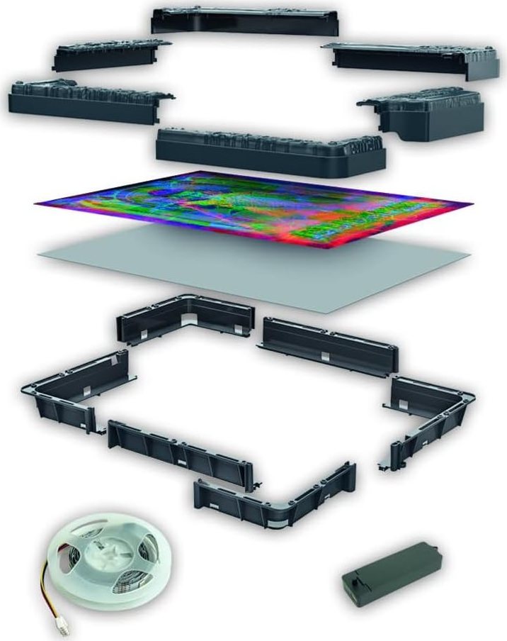 - Balenie obsahuje: puzzle, tvrdý kartón, lepidlo, montážny plastový rám, elektronický modul, RGB LED pásik, referenčný plagát a návod na použitie.