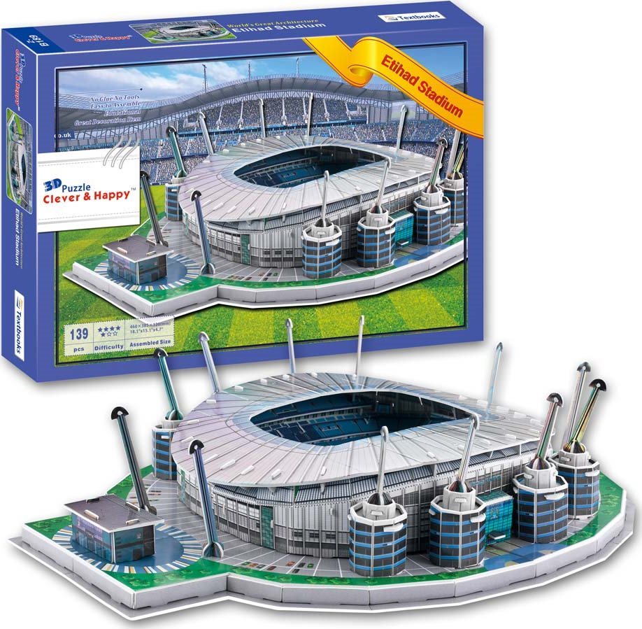 3D puzzle Futbalový štadión Etihad - domáce ihrisko klubu FC Manchester City. Na skladanie nepotrebujete nožnice ani lepidlo. Detailná replika štadióna, obtiažnosť 5,7. Ideálny darček pre všetkých futbalových fanúšikov. Rozmer zloženého puzzle cca 46 x 38,5 x 12 cm