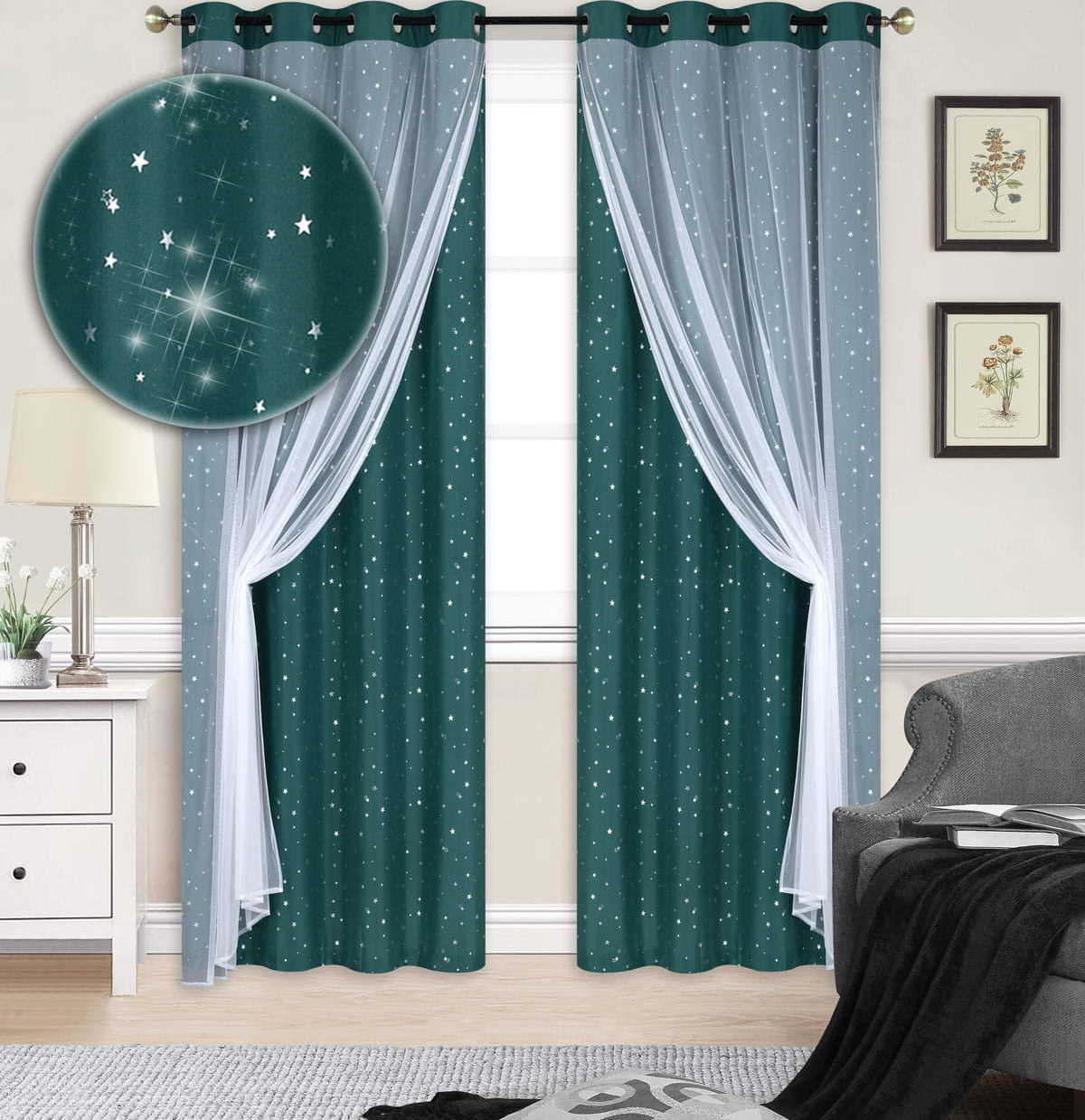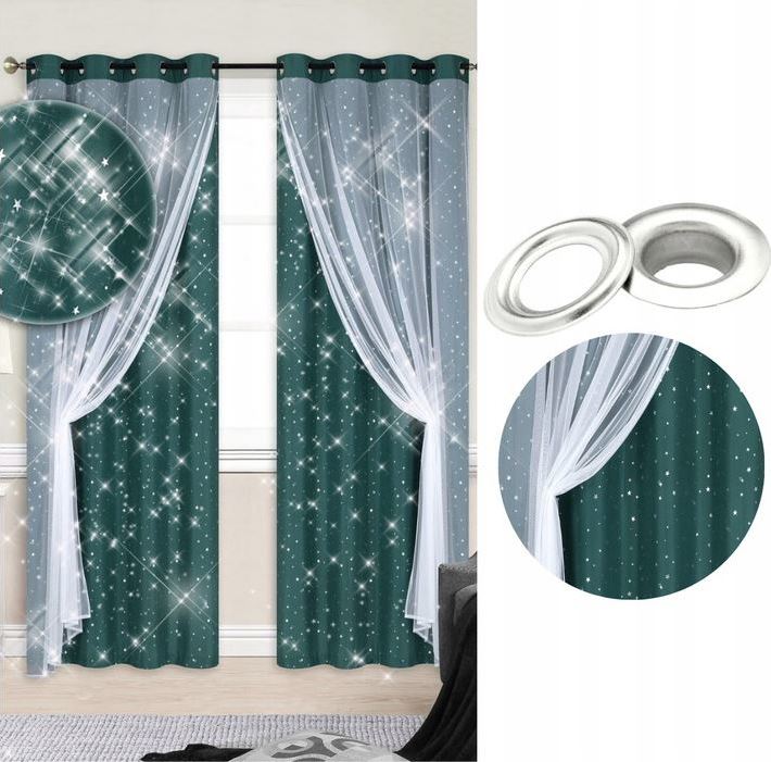 Nádherný dekoračný dvojvrstvový záves 2v1 oživí každý interiér. Záves sa skladá z dvoch častí - prvú vnútornú časť tvorí hladká, matná farebná látka s hustou väzbou. Vonkajšiu stranu tvorí kvalitná biela hladká záclona. Farebný záves je navyše zdobený potlačou drobných hviezdičiek, čím získava romantický vzhľad. Použitý materiál na závesy je polozatemňovací, prepustí slnečné lúče v malom množstve, ale miestnosť stopercentne nezatemní. Vďaka vhodne zvoleným farebným doplnkom ľahko zmeníte ráz svojej izby, záves dodá eleganciu a originálny vzhľad každej miestnosti. Bude krásne vyzerať v obývacej izbe, jedálni spálni a aj v detskej izbe.