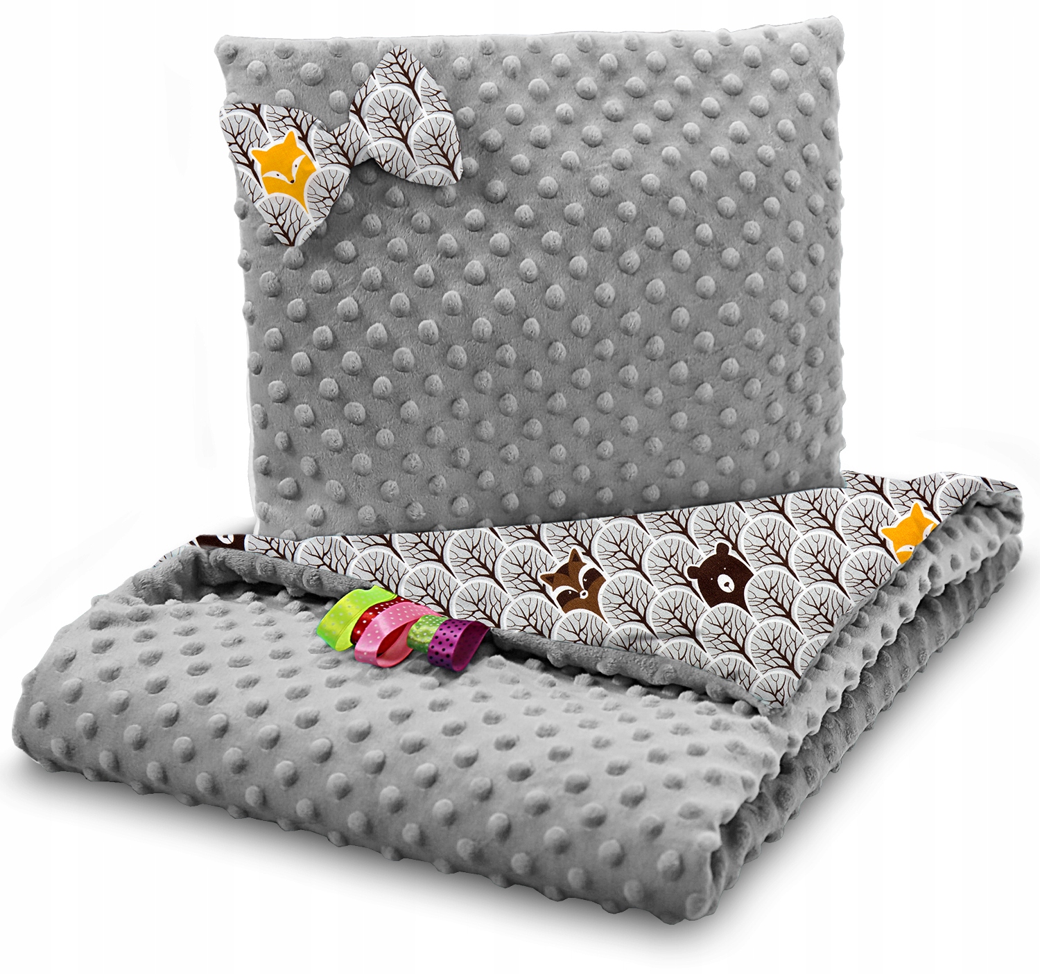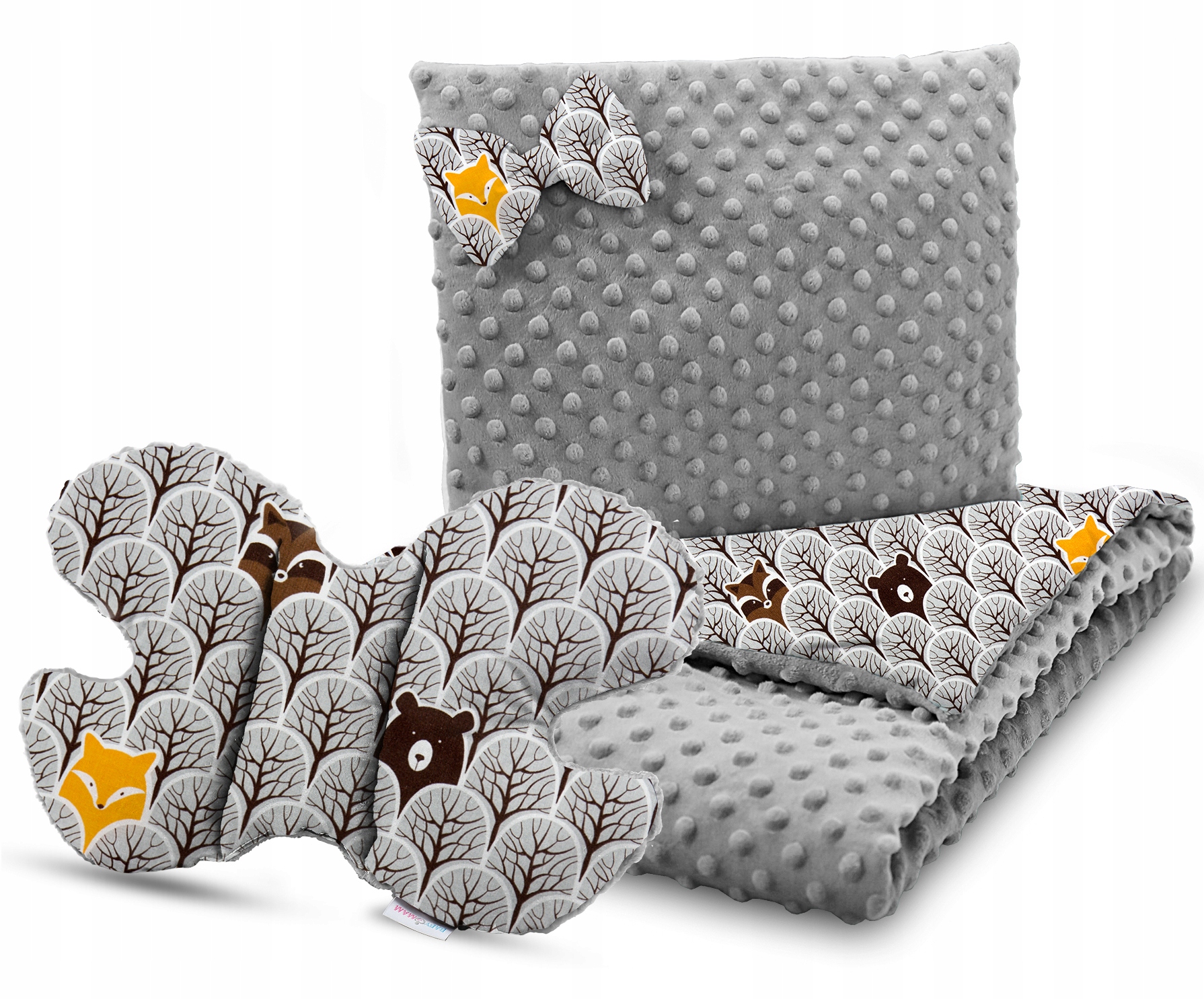 Detská deka do kočíka s vankúšikom a motýlikom - PREMIUM set 3v1 - Škandinávsky les hnedý so sivou Minky