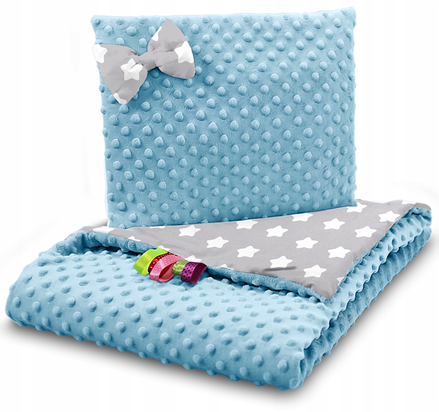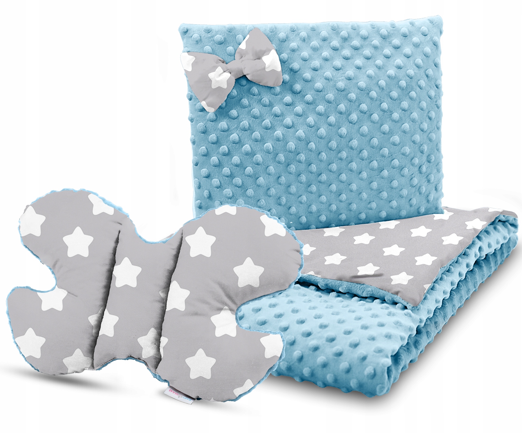 Detská deka do kočíka s vankúšikom a motýlikom - PREMIUM set 3v1 - Veľké biele hviezdičky s modrou Minky