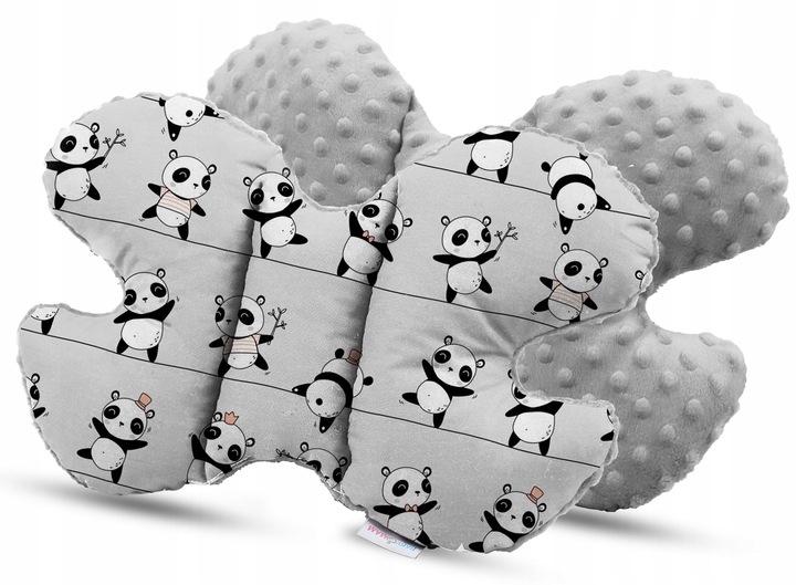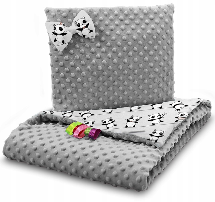 Detská deka do kočíka s vankúšikom a motýlikom - PREMIUM set 3v1 - Veselé pandy so sivou Minky