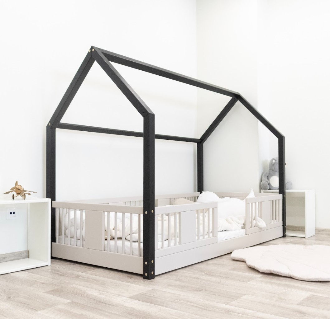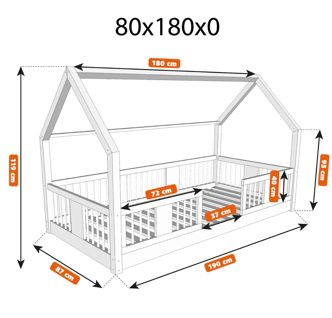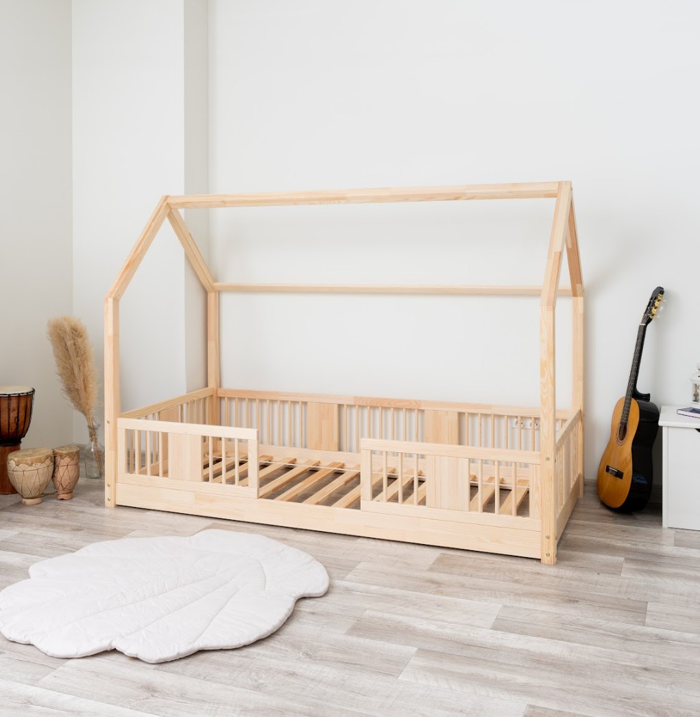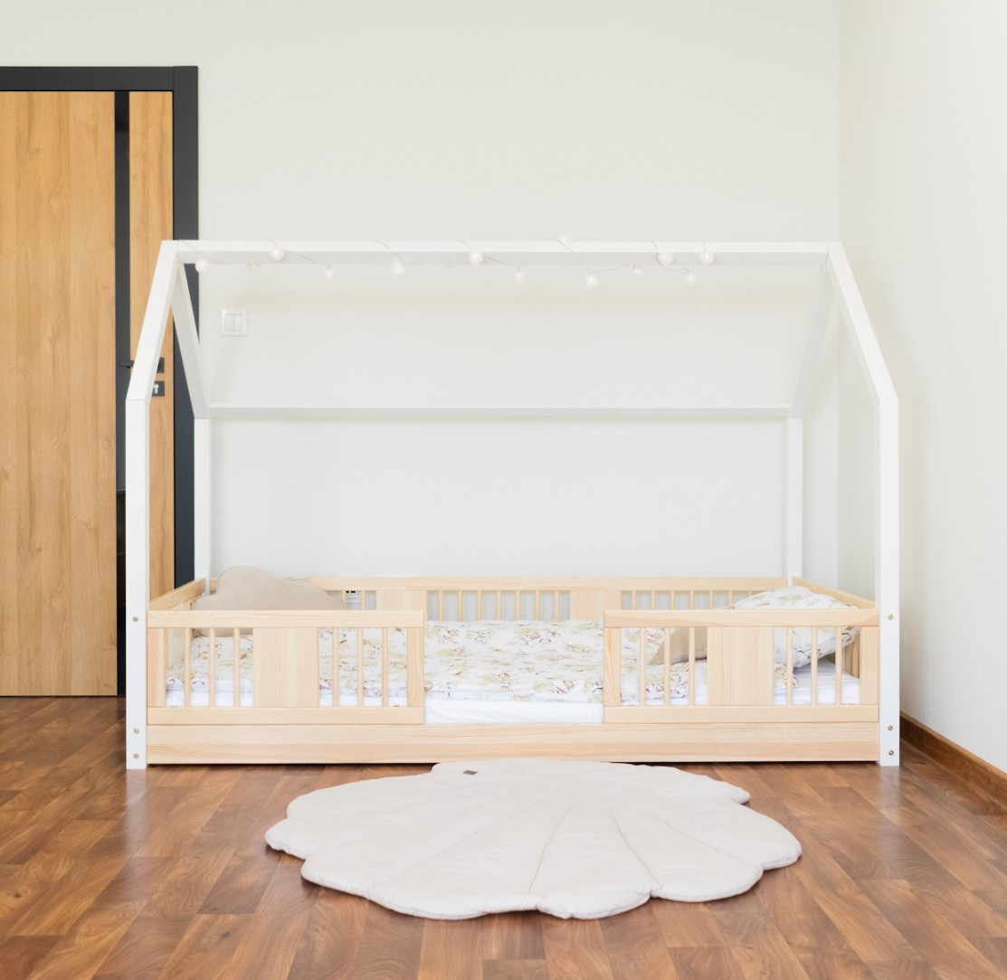 Montessori posteľ LUNA L je nízka detská posteľ v tvare domčeka určená pre najmenších, ktorí ešte len začínajú svoje dobrodružstvo so samostatným spánkom. Jej rám, umiestnený priamo na podlahe, minimalizuje riziko pádu a zároveň dáva dieťaťu pocit nezávislosti a bezpečia. Táto jednolôžková posteľ vytvára harmonický priestor pre pokojný spánok, prvé hranie a chvíle strávené s rodičmi pri čítaní rozprávok. Princíp Montessori kladie dôraz na voľnosť dieťaťa, čo táto posteľ ponúka. Je to perfektná voľba pre rodičov, ktorí hľadajú prvú posteľ pre svoje dieťa, kombinujúce estetiku, odolnosť a bezpečnosť v duchu štýlu Montessori. Posteľ LUNA je vyrobená z prírodného, lepeného borovicového dreva - materiálu, ktorý do každej miestnosti vnáša teplo, sviežosť a pokoj. Na povrchovú úpravu boli použité ekologické farby na vodnej báze, ktoré spĺňajú bezpečnostné normy. Posteľ ponúkame aj vo verzii bez povrchových úprav - nelakované drevo. Vďaka tomu sa dá ľahko prispôsobiť - jej vzhľad môžete upraviť morením, lakovaním alebo maľovaním podľa vlastného uváženia. Výrazné okrúhle lamely dodávajú posteli ľahký a príjemný pocit. Ich mäkký tvar robí posteľ decentnou a elegantnou a zároveň zostáva úplne bezpečná pre najmladších užívateľov. Dlhé drevené nebesá typu LONG dodáva posteli jedinečný, rozprávkový nádych. Ich pretiahnutý tvar vytvára dojem útulnej chalúpky, kde deti nielen spia, ale taktiež si vymýšľajú vlastné hry a príbehy. Je to ideálne miesto pre ich fantáziu - len pár vankúšov, nebesia alebo niekoľko lampičiek dokáže premeniť posteľ na kúzelný detský kútik. Každý prvok rámu bol precízne vyleštený a hrany sú jemne zaoblené, aby bolo zaistené maximálne pohodlie a bezpečnosť. Bezpečnostné zábrany pri vstupe do postele sú odnímateľné.