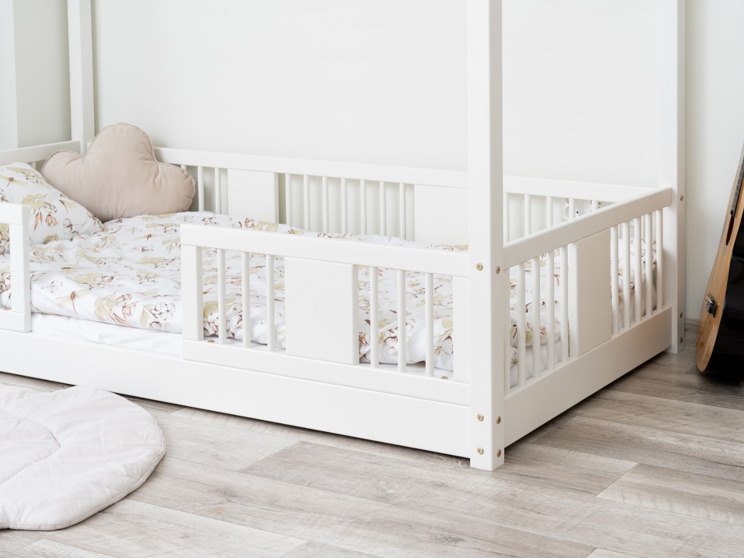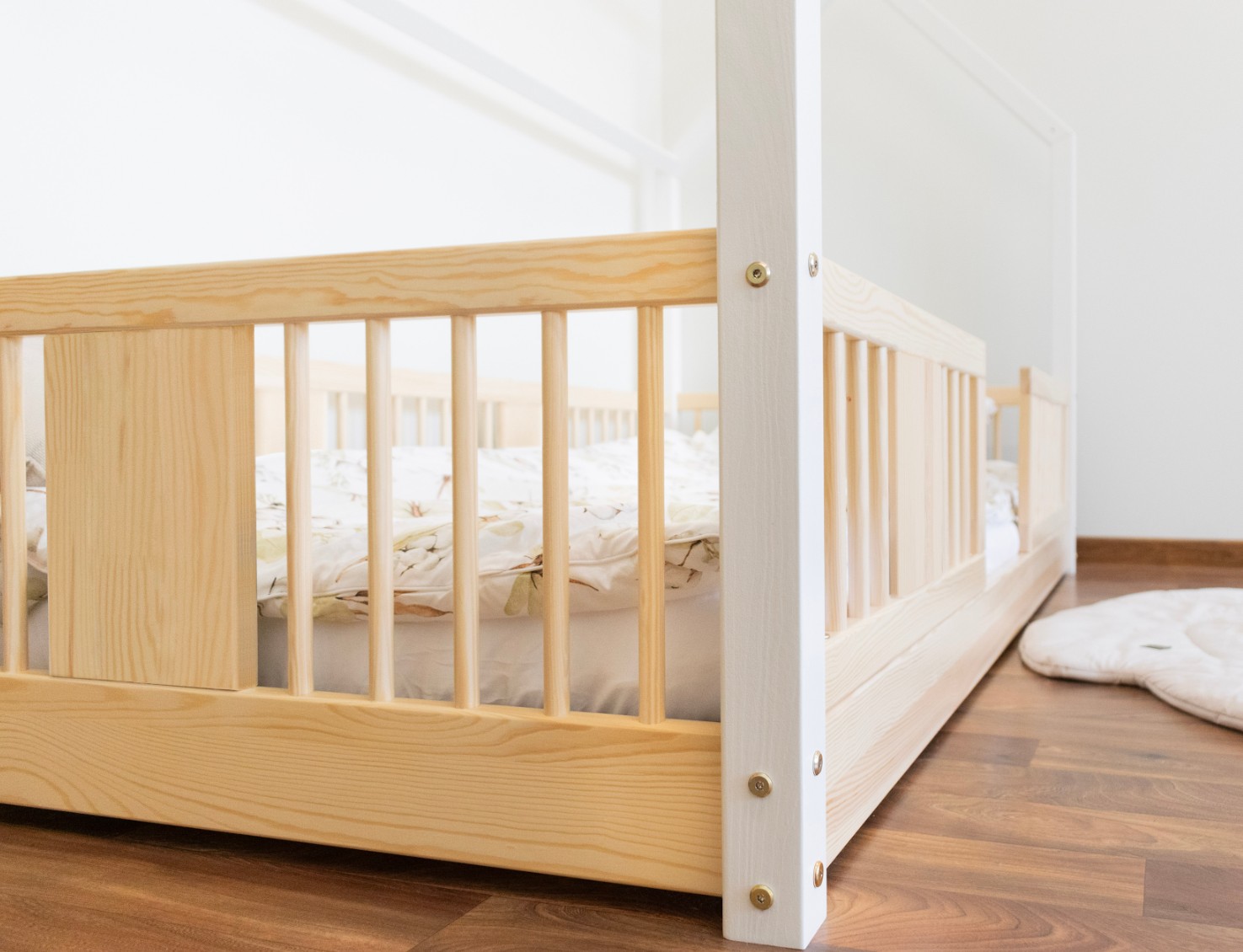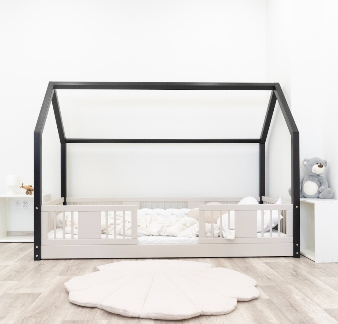 Montessori posteľ LUNA L je nízka detská posteľ v tvare domčeka určená pre najmenších, ktorí ešte len začínajú svoje dobrodružstvo so samostatným spánkom. Jej rám, umiestnený priamo na podlahe, minimalizuje riziko pádu a zároveň dáva dieťaťu pocit nezávislosti a bezpečia. Táto jednolôžková posteľ vytvára harmonický priestor pre pokojný spánok, prvé hranie a chvíle strávené s rodičmi pri čítaní rozprávok. Princíp Montessori kladie dôraz na voľnosť dieťaťa, čo táto posteľ ponúka. Je to perfektná voľba pre rodičov, ktorí hľadajú prvú posteľ pre svoje dieťa, kombinujúce estetiku, odolnosť a bezpečnosť v duchu štýlu Montessori. Posteľ LUNA je vyrobená z prírodného, lepeného borovicového dreva - materiálu, ktorý do každej miestnosti vnáša teplo, sviežosť a pokoj. Na povrchovú úpravu boli použité ekologické farby na vodnej báze, ktoré spĺňajú bezpečnostné normy. Posteľ ponúkame aj vo verzii bez povrchových úprav - nelakované drevo. Vďaka tomu sa dá ľahko prispôsobiť - jej vzhľad môžete upraviť morením, lakovaním alebo maľovaním podľa vlastného uváženia. Výrazné okrúhle lamely dodávajú posteli ľahký a príjemný pocit. Ich mäkký tvar robí posteľ decentnou a elegantnou a zároveň zostáva úplne bezpečná pre najmladších užívateľov. Dlhé drevené nebesá typu LONG dodáva posteli jedinečný, rozprávkový nádych. Ich pretiahnutý tvar vytvára dojem útulnej chalúpky, kde deti nielen spia, ale taktiež si vymýšľajú vlastné hry a príbehy. Je to ideálne miesto pre ich fantáziu - len pár vankúšov, nebesia alebo niekoľko lampičiek dokáže premeniť posteľ na kúzelný detský kútik. Každý prvok rámu bol precízne vyleštený a hrany sú jemne zaoblené, aby bolo zaistené maximálne pohodlie a bezpečnosť. Bezpečnostné zábrany pri vstupe do postele sú odnímateľné.