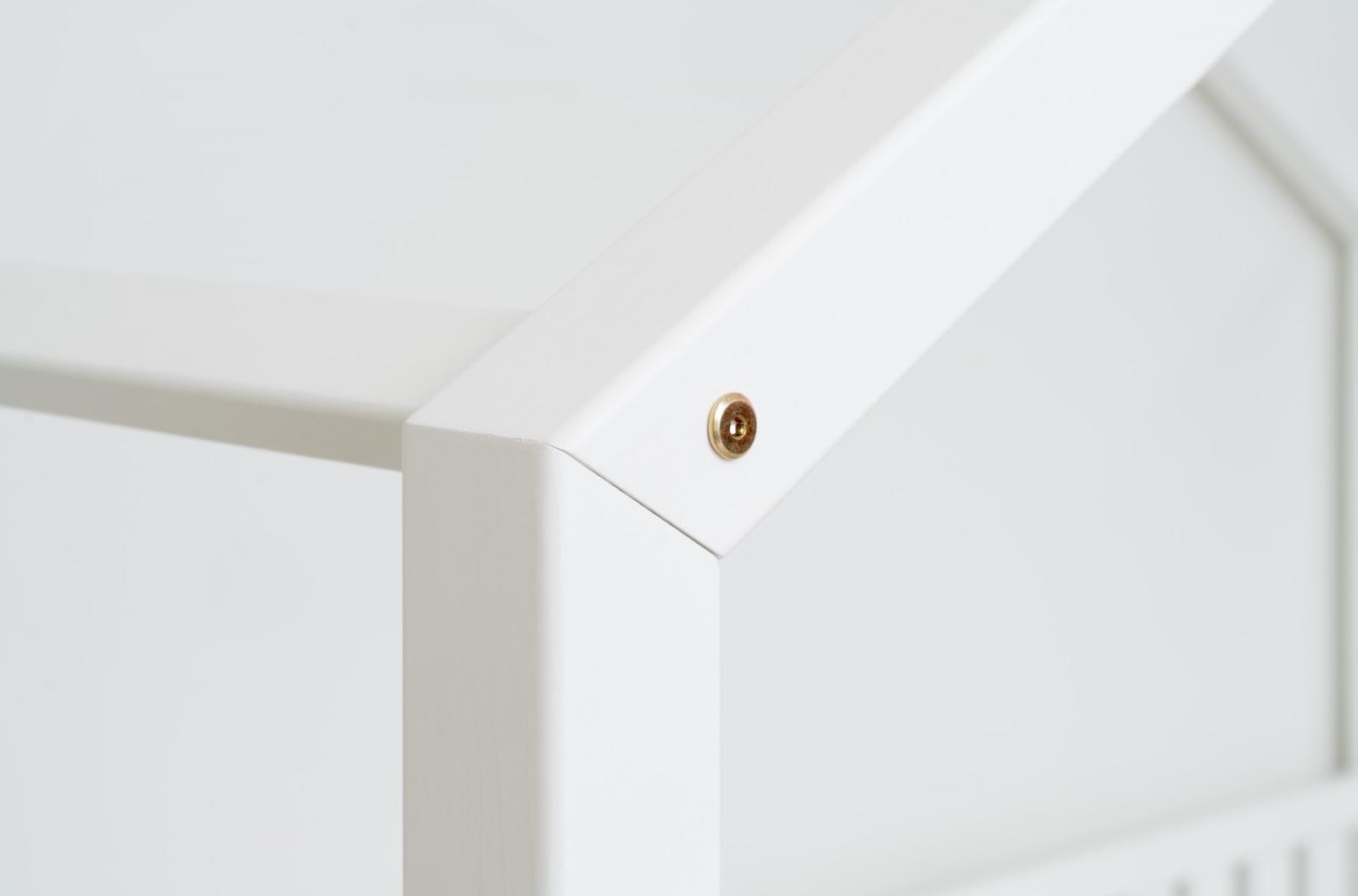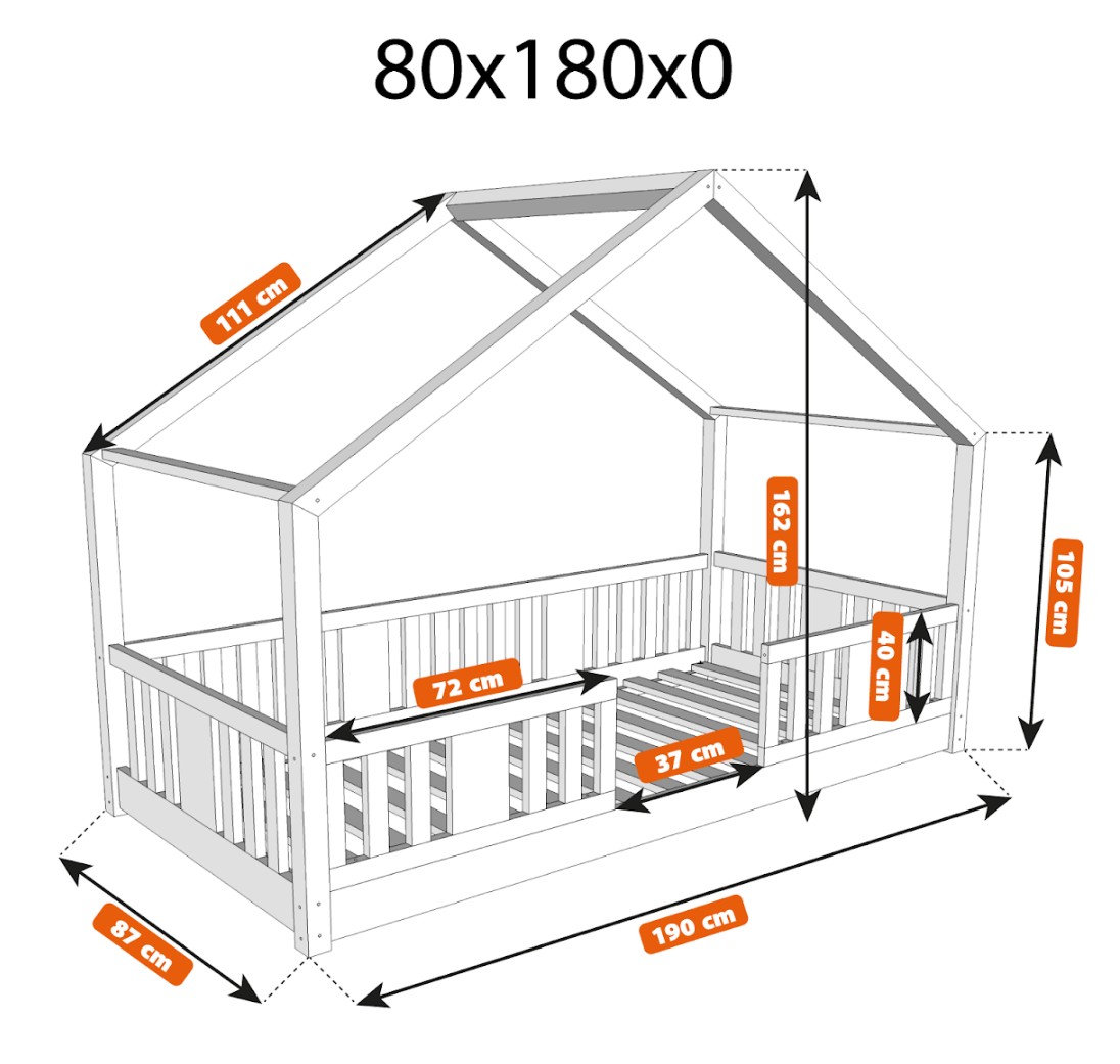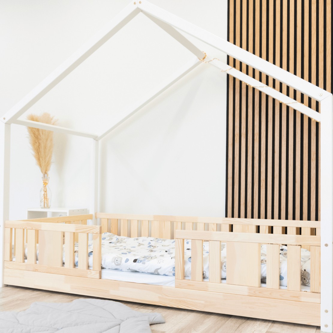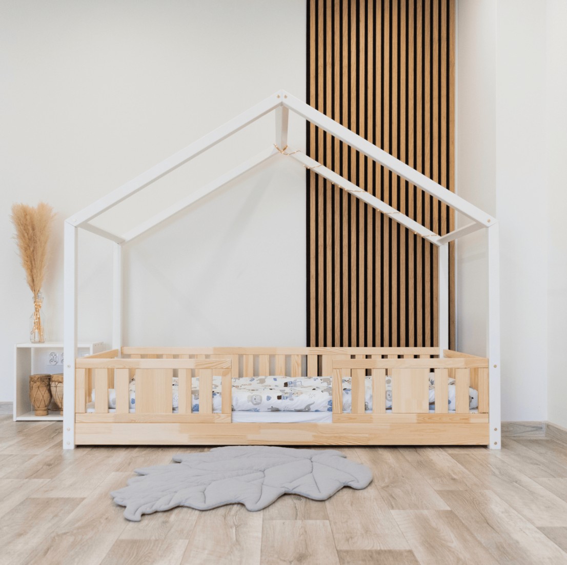Montessori posteľ NIKO S je nízka detská posteľ v tvare domčeka, ktorá v sebe spája funkčnosť, bezpečnosť a očarujúce design. Rám, umiestnený priamo na podlahe, umožňuje vášmu dieťaťu samostatne vliezť do postele az nej vyliezať, čo podporuje nezávislosť a pocit bezpečia. Princíp Montessori kladie dôraz na voľnosť dieťaťa, čo táto posteľ ponúka. Charakteristický drevený baldachýn premení túto klasickú jednolôžko na útulný domček na spanie a hranie. NIKO S kombinuje funkčnosť s kúzlom detstva a ponúka bezpečné miesto na spánok a hranie v jednom. Posteľ je vyrobená výhradne z prírodného borovicového dreva o sile 2,2 cm, ceneného pre svoju odolnosť, stabilitu a hrejivý vzhľad. Drevo bolo starostlivo brúsené a všetky hrany sú jemne zaoblené, aby bola zaistená maximálna bezpečnosť pre najmladších užívateľov. Celá konštrukcia je povrchovo upravená ekologickými farbami na vodnej báze, ktoré spĺňajú európsku normu EN 71-3. Farby sú bez zápachu, netoxické a bezpečné aj pre alergikov. Posteľ ponúkame aj vo verzii bez povrchových úprav - nelakované drevo. Vďaka tomu sa dá ľahko prispôsobiť - jej vzhľad môžete upraviť morením, lakovaním alebo maľovaním podľa vlastného uváženia. Nie je to len posteľ na spanie – je to malý drevený domček, ktorý rozvíja detskú fantáziu a podporuje kreatívnu hru. Drevená strieška vo verzii SHORT vytvára jedinečne útulnú atmosféru, ktorú je možné ľahko vylepšiť svetlami, látkami alebo girlandami.