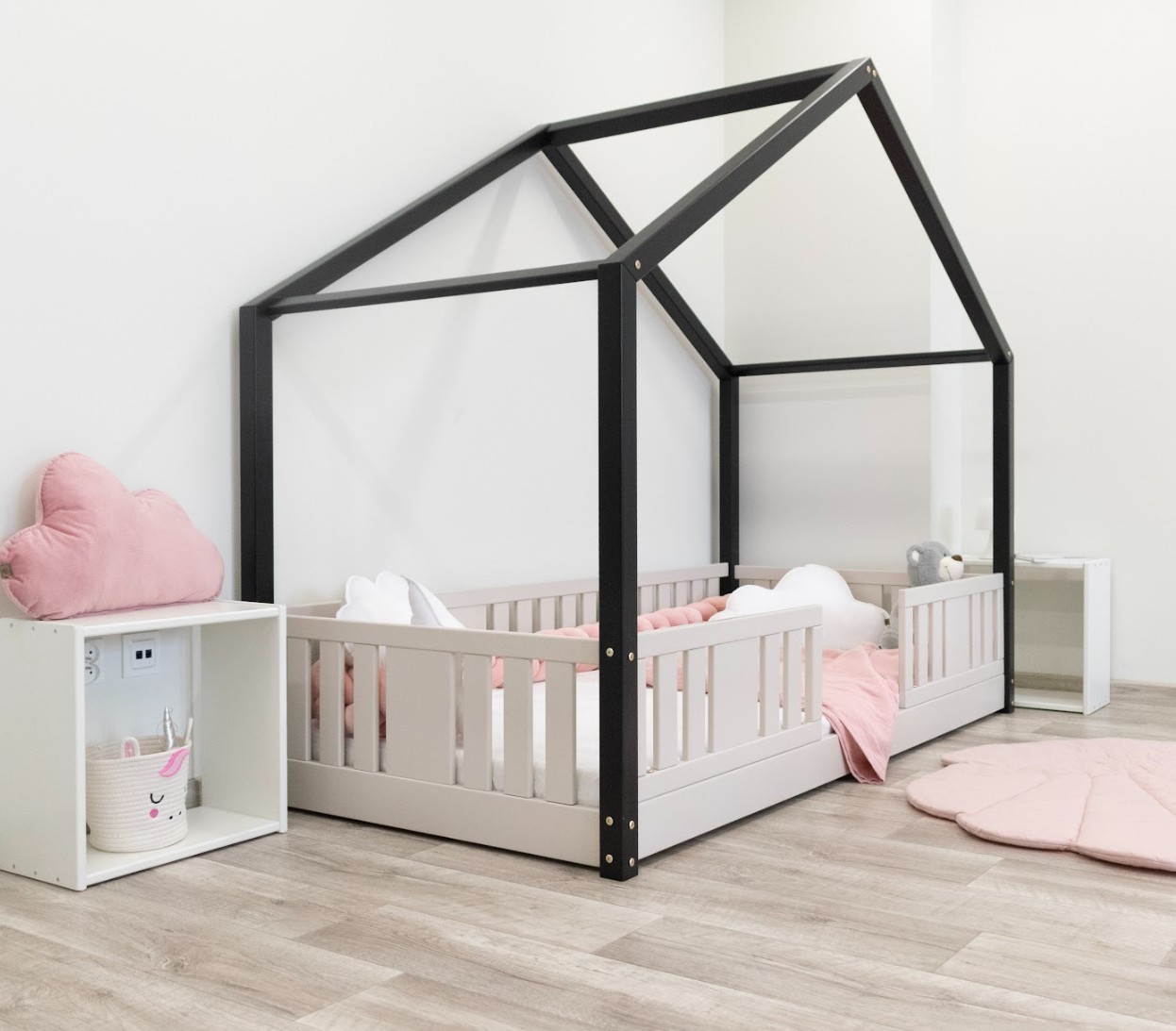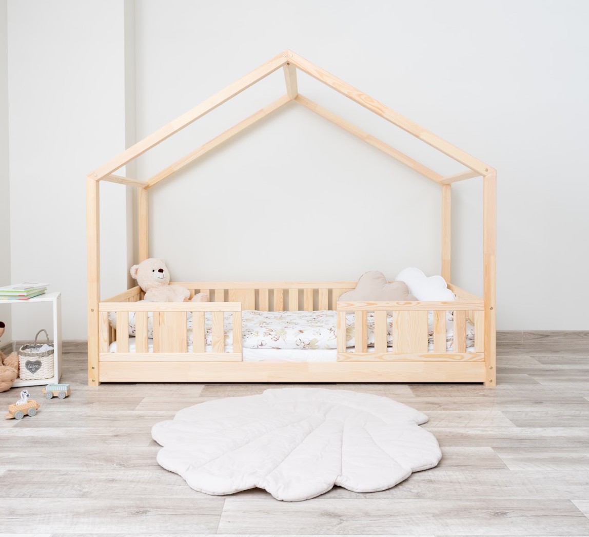 Montessori posteľ NIKO S je nízka detská posteľ v tvare domčeka, ktorá v sebe spája funkčnosť, bezpečnosť a očarujúce design. Rám, umiestnený priamo na podlahe, umožňuje vášmu dieťaťu samostatne vliezť do postele az nej vyliezať, čo podporuje nezávislosť a pocit bezpečia. Princíp Montessori kladie dôraz na voľnosť dieťaťa, čo táto posteľ ponúka. Charakteristický drevený baldachýn premení túto klasickú jednolôžko na útulný domček na spanie a hranie. NIKO S kombinuje funkčnosť s kúzlom detstva a ponúka bezpečné miesto na spánok a hranie v jednom. Posteľ je vyrobená výhradne z prírodného borovicového dreva o sile 2,2 cm, ceneného pre svoju odolnosť, stabilitu a hrejivý vzhľad. Drevo bolo starostlivo brúsené a všetky hrany sú jemne zaoblené, aby bola zaistená maximálna bezpečnosť pre najmladších užívateľov. Celá konštrukcia je povrchovo upravená ekologickými farbami na vodnej báze, ktoré spĺňajú európsku normu EN 71-3. Farby sú bez zápachu, netoxické a bezpečné aj pre alergikov. Posteľ ponúkame aj vo verzii bez povrchových úprav - nelakované drevo. Vďaka tomu sa dá ľahko prispôsobiť - jej vzhľad môžete upraviť morením, lakovaním alebo maľovaním podľa vlastného uváženia. Nie je to len posteľ na spanie – je to malý drevený domček, ktorý rozvíja detskú fantáziu a podporuje kreatívnu hru. Drevená strieška vo verzii SHORT vytvára jedinečne útulnú atmosféru, ktorú je možné ľahko vylepšiť svetlami, látkami alebo girlandami.