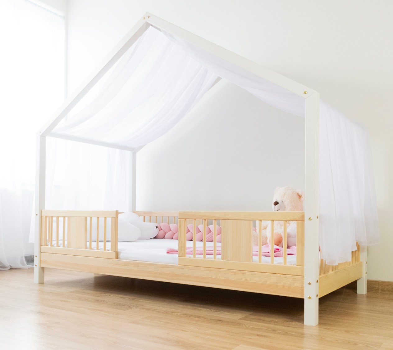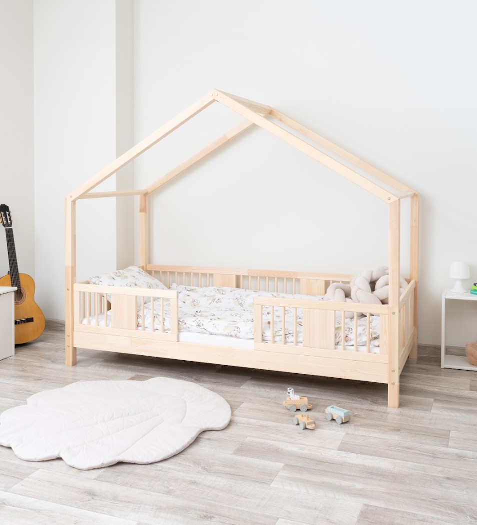 LUNA S 10 je unikátne jednolôžko pre deti, ktoré kombinuje škandinávsku jednoduchosť, prírodnú krásu dreva a rozprávkový charakter malého domu. O 10 cm vyšší rám uľahčuje udržovanie čistoty pod posteľou a zároveň zachováva nenápadný dizajn – bezpečný aj pre najmenších. Je to perfektná voľba pre rodičov, ktorí hľadajú kombináciu estetiky, funkčnosti a pohodlia. Posteľ LUNA S 10 zaujme svojimi jemnými, harmonickými líniami a detailmi inšpirovanými prírodou. Rám z prírodného borovicového dreva vytvára pevnú a stabilnú konštrukciu, ktorú zdôrazňujú zaoblené, sústružené priečky. Ich mäkký tvar evokuje klasický detský nábytok, ale s moderným, ľahkým nádychom. Povrchová úprava je prevedená ekologickými farbami na vodnej báze, ktoré spĺňajú európsku normu EN 71-3 – bez zápachu, toxínov a škodlivých látok. Vďaka tomu je posteľ LUNA S 10 ideálna do izieb alergikov alebo dojčiat. Posteľ ponúkame aj vo verzii bez povrchových úprav - nelakované drevo. Vďaka tomu sa dá ľahko prispôsobiť - jej vzhľad môžete upraviť morením, lakovaním alebo maľovaním podľa vlastného uváženia. Drevený baldachýn dotvára dizajn a dodáva posteli útulný vzhľad. Jej minimalistický dizajn umožňuje jednoduchú dekoráciu – stačí len trocha fantázie a premení sa na snový kútik na spanie a hranie. Jemne zaoblené hrany a starostlivo leštený povrch robí posteľ úplne bezpečnú a príjemnú na dotyk. Nohy vysoké 10 cm jej dodávajú vizuálnu ľahkosť, vďaka čomu je esteticky príjemným doplnkom každého interiéru – či už vo svetlom izbe v škandinávskom štýle alebo v útulnom priestore zariadenom v teplých drevených tónoch.
