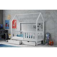 Domčeková posteľ je splneným snom každého dieťaťa! Tento typ nábytku podnecuje fantáziu počas dňa a umožňuje bezpečný a pohodlný spánok v noci. MAGDA je jednolôžková detská posteľ v tvare domčeka. Jedná sa o ľahký, odolný a priestranný kus nábytku, ktorý dá izbičke vášho dieťaťa úplne novú kvalitu. Posteľ je vyrobená z masívneho borovicového dreva , vďaka čomu je mimoriadne pevná a odolná proti poškodeniu. U bočníc a čiel je šírka použitého materiálu 2,6 cm . Posteľ je ošetrená lakom na vodnej báze, ktorý je ekologický, šetrný k pokožke a odolný voči rôznym druhom poškodenia. Bezpečnostná zábrana zaistí vášmu dieťaťu bezpečný spánok po celú noc a zabráni možnosti vypadnutia. Bariérka je odnímateľná a je možné ju umiestniť na pravú aj ľavú stranu postele. Posteľ je navyše dodávaná s dvoma hlbokými zásuvkami , ktoré je možné využiť ako miesto pre lôžkoviny alebo hračky. Súčasťou postele je aj kvalitný pevný rošt . Funkčnosť, pohodlie a netradičný vzhľad robia z Magdy zaujímavý prvok, ktorý sa bude vynímať v každej detskej izbičke.
