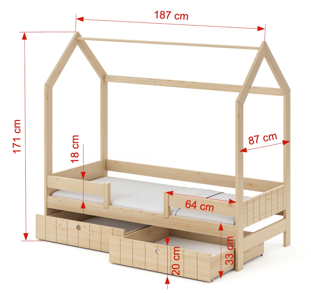 Detská posteľ NAOMI s konštrukciou v štýle domčeka je jedinečnou kombináciou funkčnosti, bezpečnosti a estetického dizajnu, ideálna do detskej alebo tínedžerskej izby. Jej výrazná konštrukcia v tvare domčeka vytvára útulnú atmosféru, ktorá vedie k relaxácii a zároveň stimuluje detskú fantáziu a podporuje kreatívnu hru. Rám postele je vyrobený z vysoko kvalitného borovicového dreva, ktoré sa vyznačuje odolnosťou, stabilitou a prírodným vzhľadom. Pevná konštrukcia unesie nosnosť až 100 kg, čo zaisťuje bezpečné a pohodlné používanie po mnoho rokov. Posteľ je vybavená dvoma bezpečnostnými zábranami umiestnenými na protiľahlých stranách čela postele, ktoré účinne chránia dieťa pred vypadnutím počas spánku. Posteľ v štýle domčeka vhodná ako do malých detských izieb, tak aj do väčších interiérov v akomkoľvek štýle interiéru - od klasického po moderné. Na povrchovú úpravu postele sa používajú iba bezpečné a ekologické farby a laky s príslušnými certifikátmi, určené pre detský nábytok. Sú šetrné k životnému prostrediu a bezpečné pre zdravie detí, neemitujú škodlivé látky a spĺňajú vysoké štandardy kvality. Matrac nie je súčasťou balenia, takže si môžete vybrať detský matrac prispôsobený vašim individuálnym preferenciám pohodlia pri spaní. Posteľ je dodávaná s dvoma priestrannými šuplíkmi na kolieskach, kam si môžete uložiť lôžkoviny, hračky alebo iné nevyhnutnosti.