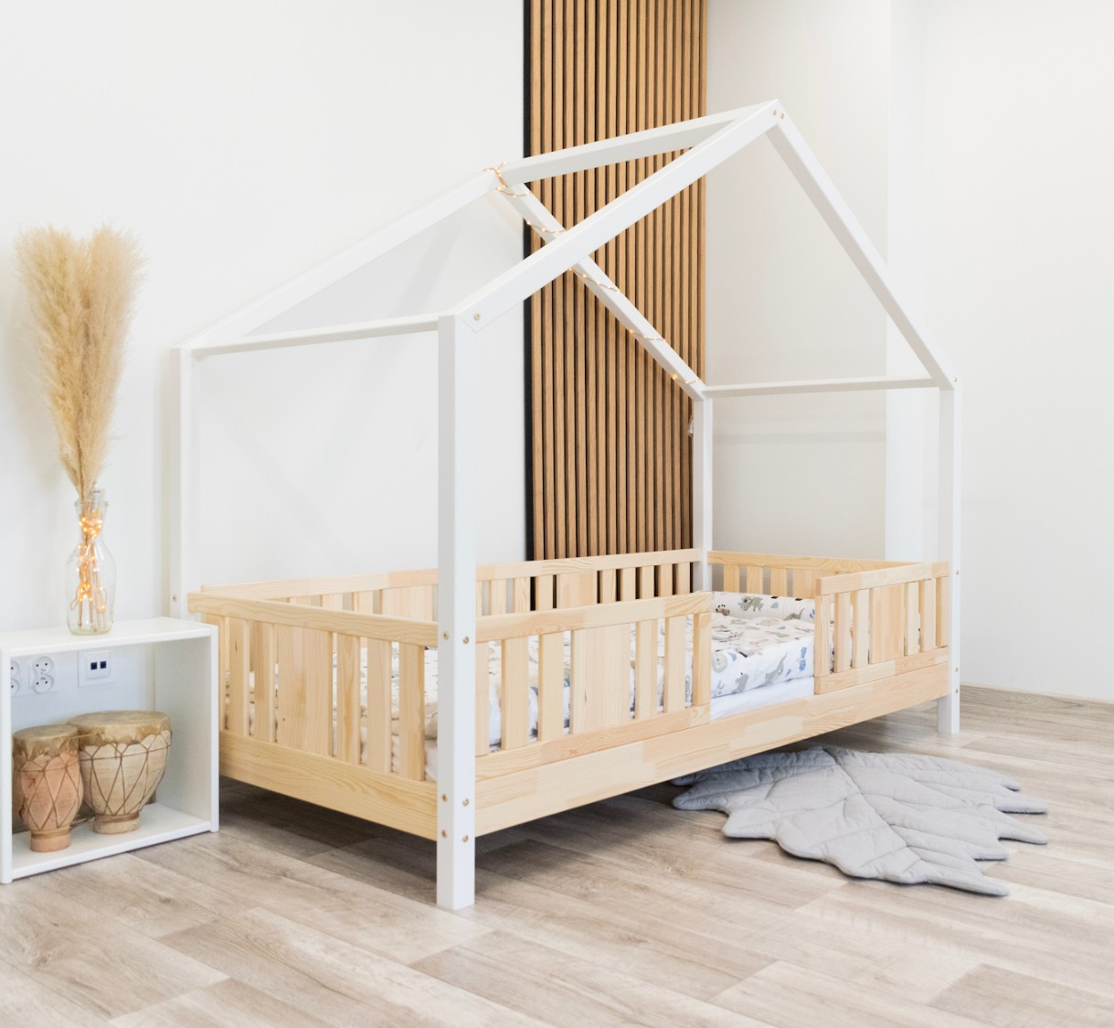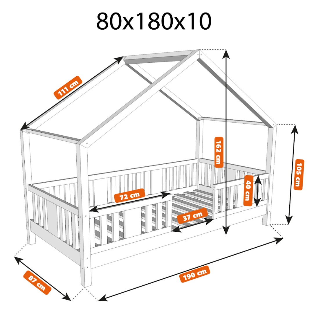 NIKO S 10 je funkčná a štýlová jednolôžková posteľ v tvare domčeka, ktorá spája kúzlo detstva s každodenným pohodlím. Rám z prírodného borovicového dreva je osadený 10 cm vysokými nohami, čo poskytuje perfektnú rovnováhu medzi bezpečnosťou a praktickosťou. Mierne zvýšený rám uľahčuje udržovanie čistoty pod posteľou a zlepšuje cirkuláciu vzduchu okolo matraca, pričom zostáva dostatočne nízky, aby vaše dieťa mohlo bezpečne vliezť a vyliezť z postele samostatne. Táto detská posteľ s nebesami podnecuje fantáziu a premieňa každodenný spánok na dobrodružstvo. Drevené nebesá vo verzii SHORT vytvárajú mimoriadne útulnú atmosféru – je možné ich ozdobiť svetielkami, girlandami alebo látkou a vytvoriť tak rozprávkový priestor na hranie, čítanie a relaxáciu. Domčeková posteľ NIKO S 10 je model navrhnutý s ohľadom na najmladších užívateľov. Jeho nízka a stabilná konštrukcia zvyšuje bezpečnosť, zatiaľ čo výška 10 cm umožňuje rodičom ľahšie udržiavať detskú izbu čistú a upratanú. Prírodné borovicové drevo o sile 2,2 cm dodáva nábytku odolnosť, stabilitu a teplý, príjemný vzhľad, ktorý dokonale dopĺňa detský interiér. Každý prvok bol starostlivo brúsený a všetky hrany sú jemne zaoblené, čím sa minimalizuje riziko zranenia pri každodennom hraní. Celý kus je natretý ekologickými farbami na vodnej báze, ktoré spĺňajú európsku normu EN 71-3. Farby sú bez zápachu, netoxické a bezpečné aj pre najmenšie deti a alergikov. Posteľ ponúkame aj vo verzii bez povrchových úprav - nelakované drevo. Vďaka tomu sa dá ľahko prispôsobiť - jej vzhľad môžete upraviť morením, lakovaním alebo maľovaním podľa vlastného uváženia.