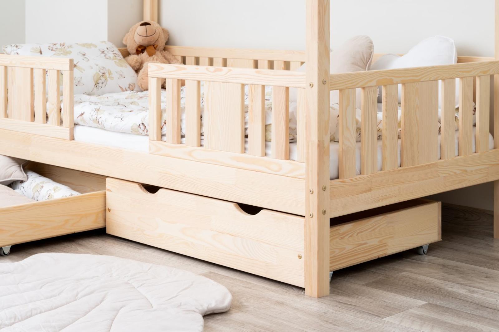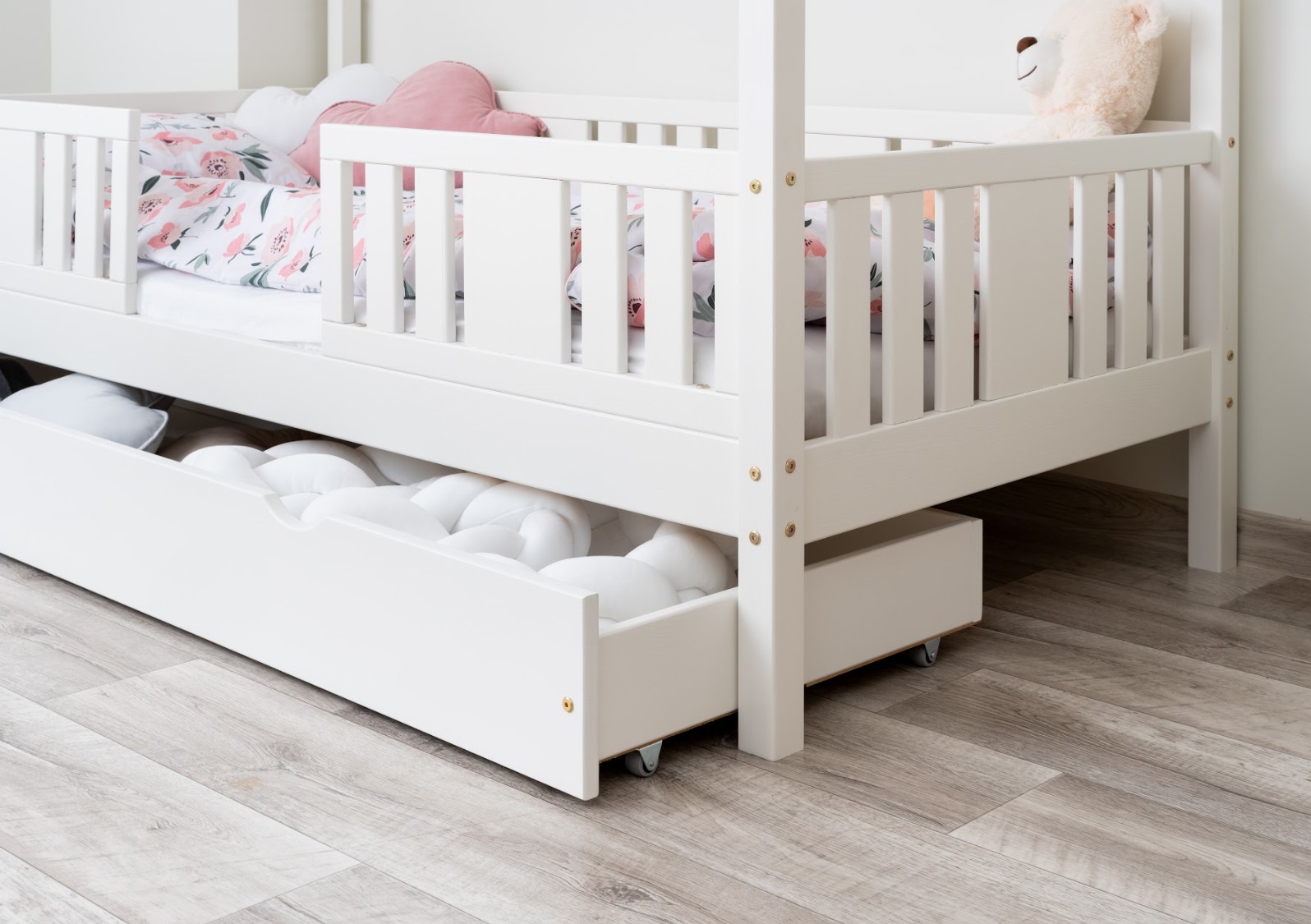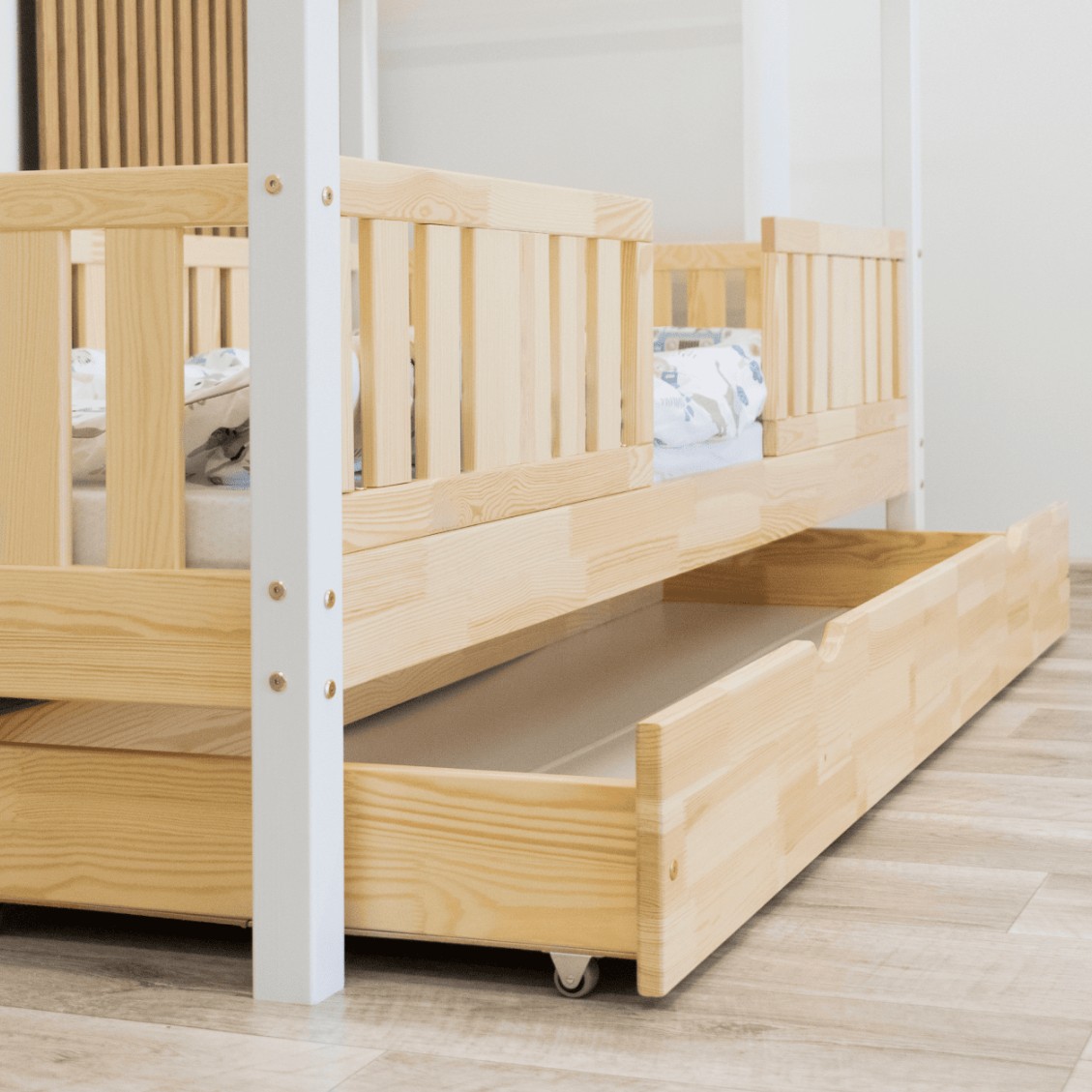 Výška nôh 20 cm otvára nové dizajnové možnosti. Pod posteľ môžete umiestniť jednu veľkú zásuvku, dve menšie alebo zásuvku s funkciou spania – ideálne riešenie pre súrodencov alebo hostí. Je to praktické miesto na uloženie posteľnej bielizne, oblečenia, diek a obľúbených hračiek, ktoré máte vždy na dosah ruky, ale mimo dohľadu. Domček NIKO S 20 bol vytvorený s ohľadom na deti, ktoré si cenia útulné priestory pre hranie a relaxáciu. Zvýšená konštrukcia kombinuje estetiku s vysokou funkčnosťou, takže je ideálna aj pre malé miestnosti.