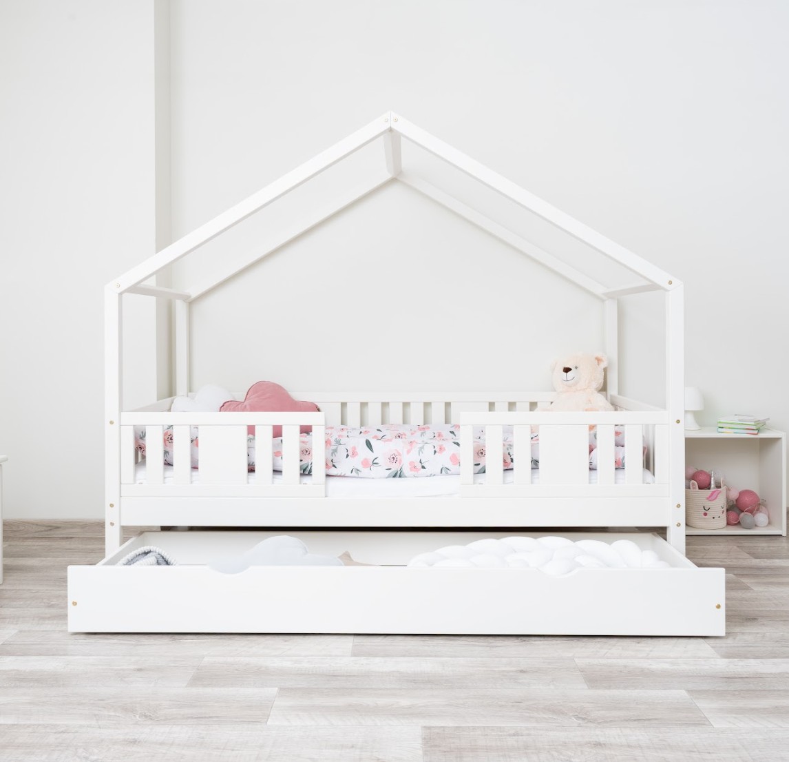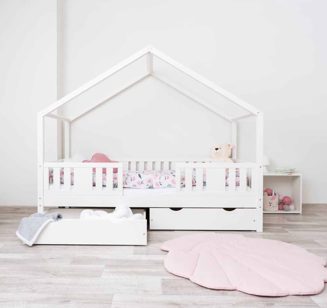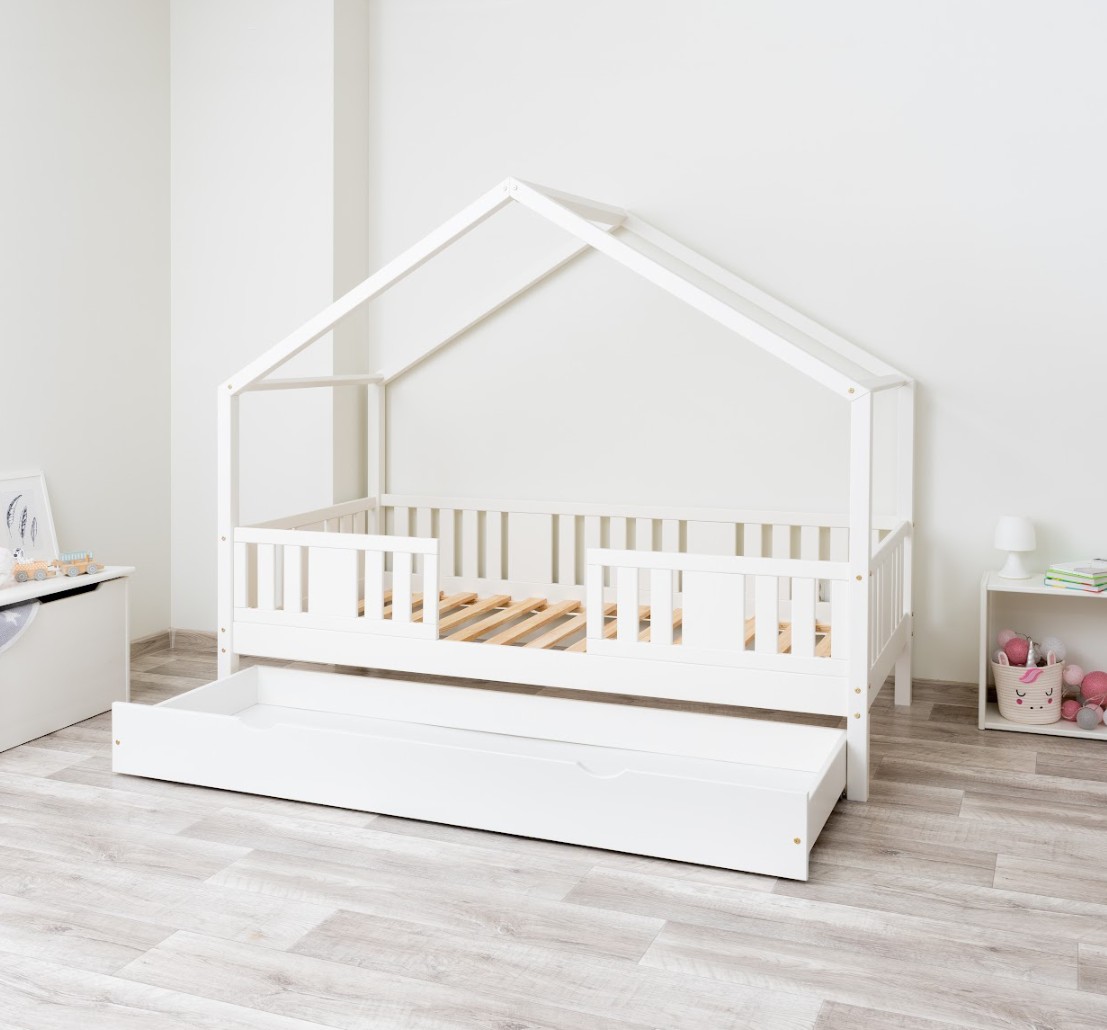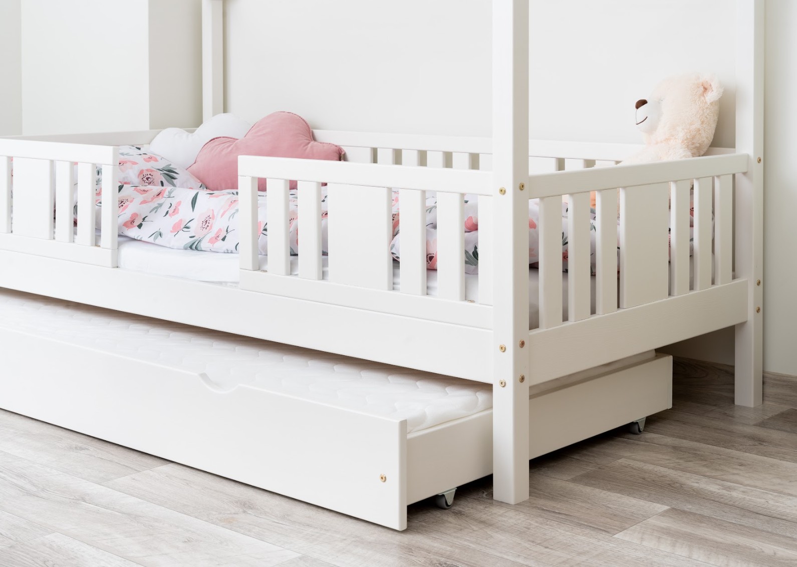 Výška nôh 20 cm otvára nové dizajnové možnosti. Pod posteľ môžete umiestniť jednu veľkú zásuvku, dve menšie alebo zásuvku s funkciou spania – ideálne riešenie pre súrodencov alebo hostí. Je to praktické miesto na uloženie posteľnej bielizne, oblečenia, diek a obľúbených hračiek, ktoré máte vždy na dosah ruky, ale mimo dohľadu. Domček NIKO S 20 bol vytvorený s ohľadom na deti, ktoré si cenia útulné priestory pre hranie a relaxáciu. Zvýšená konštrukcia kombinuje estetiku s vysokou funkčnosťou, takže je ideálna aj pre malé miestnosti.