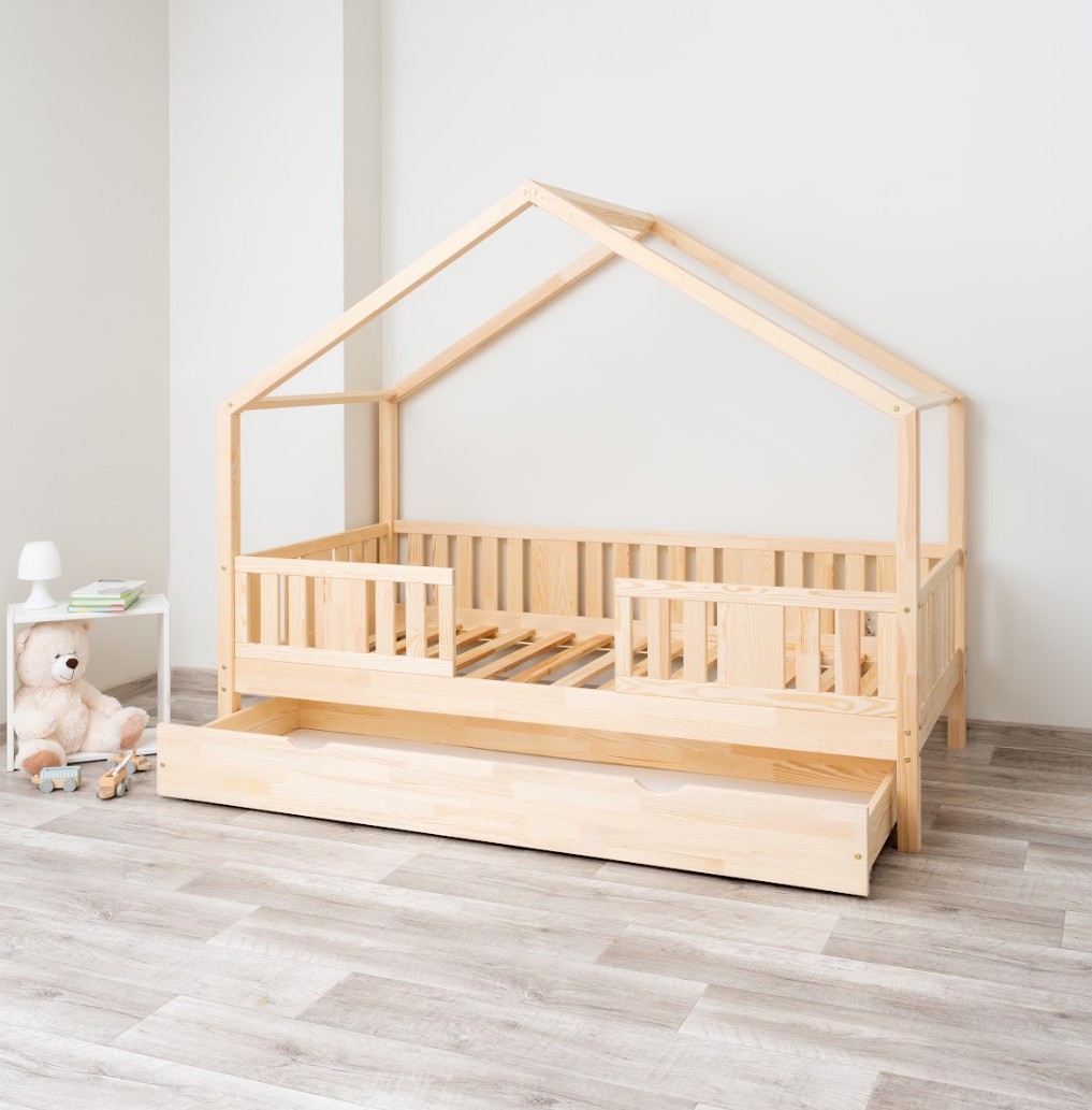 NIKO S 20 je unikátne jednolôžko v tvare domčeka, ktoré v sebe spája funkčnosť, odolnosť a rozprávkový charakter. Jej vyvýšená konštrukcia na 20cm nohách dodáva praktickosti nový rozmer – pod posteľ je možné umiestniť funkčné zásuvky alebo ďalší spací priestor. Zvýšený rám zlepšuje cirkuláciu vzduchu okolo matraca a uľahčuje udržovanie čistoty pod posteľou, čo je obzvlášť dôležité v izbách najmenších detí. Konštrukcia, vyrobená výhradne z prírodného borovicového dreva, zaručuje odolnosť, bezpečnosť a jedinečný vzhľad. Charakteristický drevený baldachýn vytvára útulný priestor, kde sa každý deň prelína spánok, hra a fantázia. Každý prvok detskej postele NIKO S 20 je vyrobený z prírodného borovicového dreva o sile 2,2 cm – trvanlivého, odolného a úplne bezpečného materiálu. Drevo je starostlivo brúsené a všetky hrany sú jemne zaoblené, čím sa minimalizuje riziko zranenia. Ekologické farby na vodnej báze, ktoré spĺňajú európsku normu EN 71-3, neobsahujú toxíny ani nepríjemné pachy. Vďaka tomu je posteľ vhodná aj pre najmenšie deti a alergikov. Posteľ ponúkame aj vo verzii bez povrchových úprav - nelakované drevo. Vďaka tomu sa dá ľahko prispôsobiť - jej vzhľad môžete upraviť morením, lakovaním alebo maľovaním podľa vlastného uváženia. Dizajn domčeka stimuluje kreativitu – cez deň sa posteľ premení na hrací priestor av noci podporuje pokoj. Stačí pridať mäkkú bavlnenú posteľnú bielizeň a tlmené osvetlenie a vytvoriť tak útulnú atmosféru na spanie.